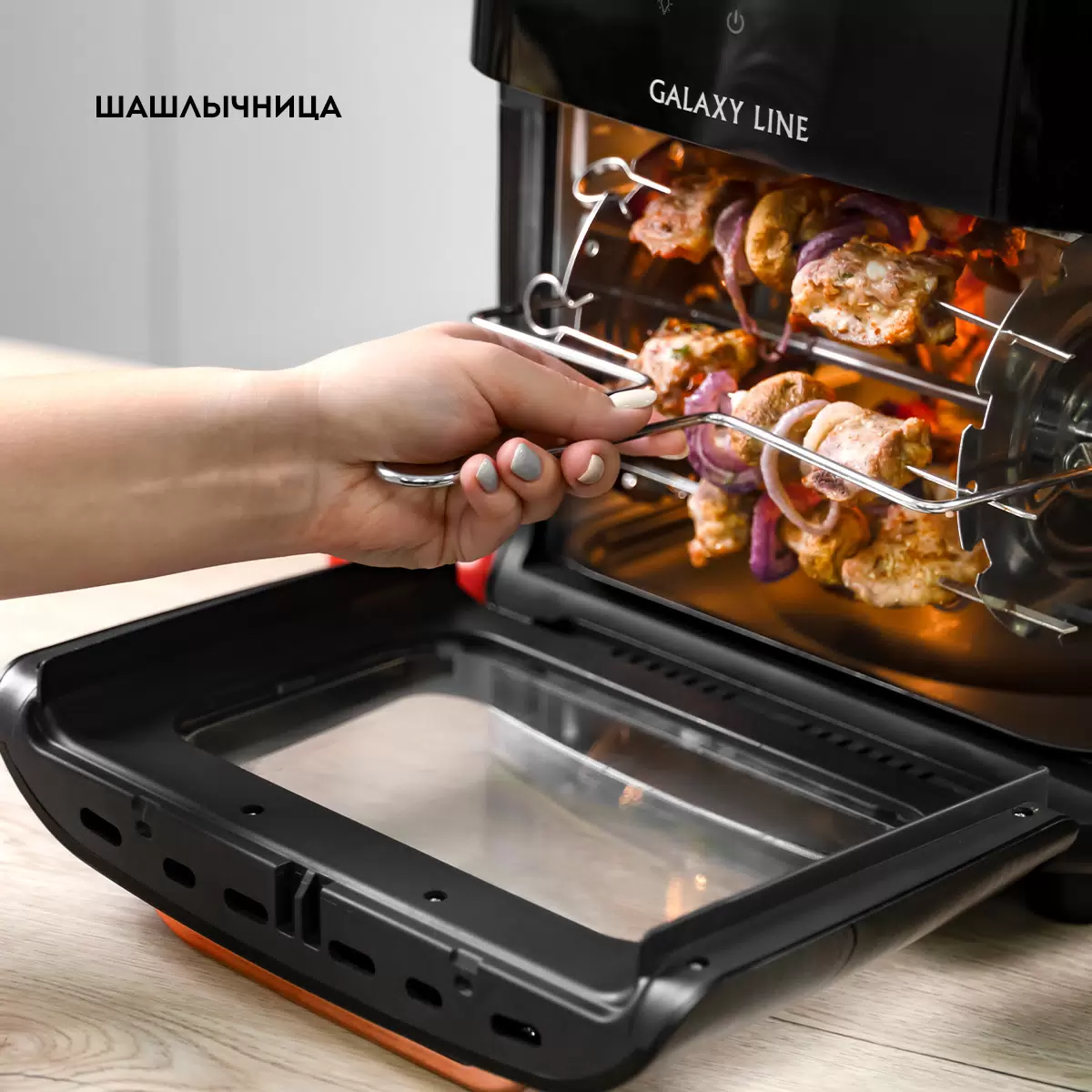- Комплект поставкиВращающаяся корзина для картофеля фри, вертел для курицы-гриль с вилками для фиксации, вращающаяся подставка с шампурами, три решетки для запекания или сушки продуктов, поддон для сбора жидкости, металлический держатель, книга рецептов
