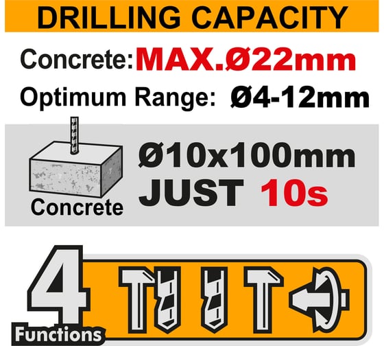 - Max диаметр сверления буром (бетон)22 мм