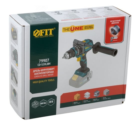 Дрель-шуруповерт аккумуляторный FIT бесщеточный 20,0 В, 0-500/2000 об/мин, 100 Нм, рез. накл., коробка 79907