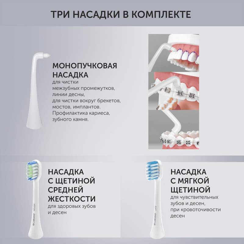 - Комплект поставкизубная щетка; монопучковая насадка; насадка с мягкой щетиной; насадка со средней щетиной; бесконтактная зарядная база; дорожный футляр для хранения; руководство по эксплуатации; гарантийный талон
