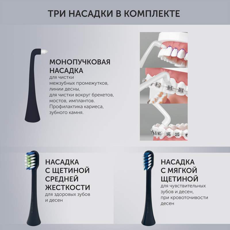 - Комплект поставкизубная щетка; монопучковая насадка; насадка с мягкой щетиной; насадка со средней щетиной; бесконтактная зарядная база; дорожный футляр для хранения; руководство по эксплуатации; гарантийный талон