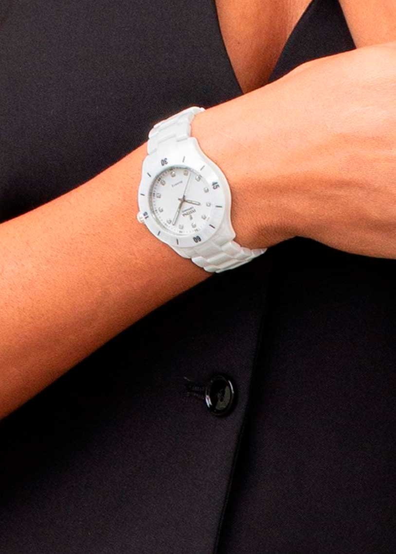 Закругленные прямоугольные стрелки в стиле Baton с люминесцентным покрытием, которое светится в темноте после непродолжительной зарядки на свету. Рифленая заводная головка. Керамический браслет со стальной раскладывающейся застежкой.