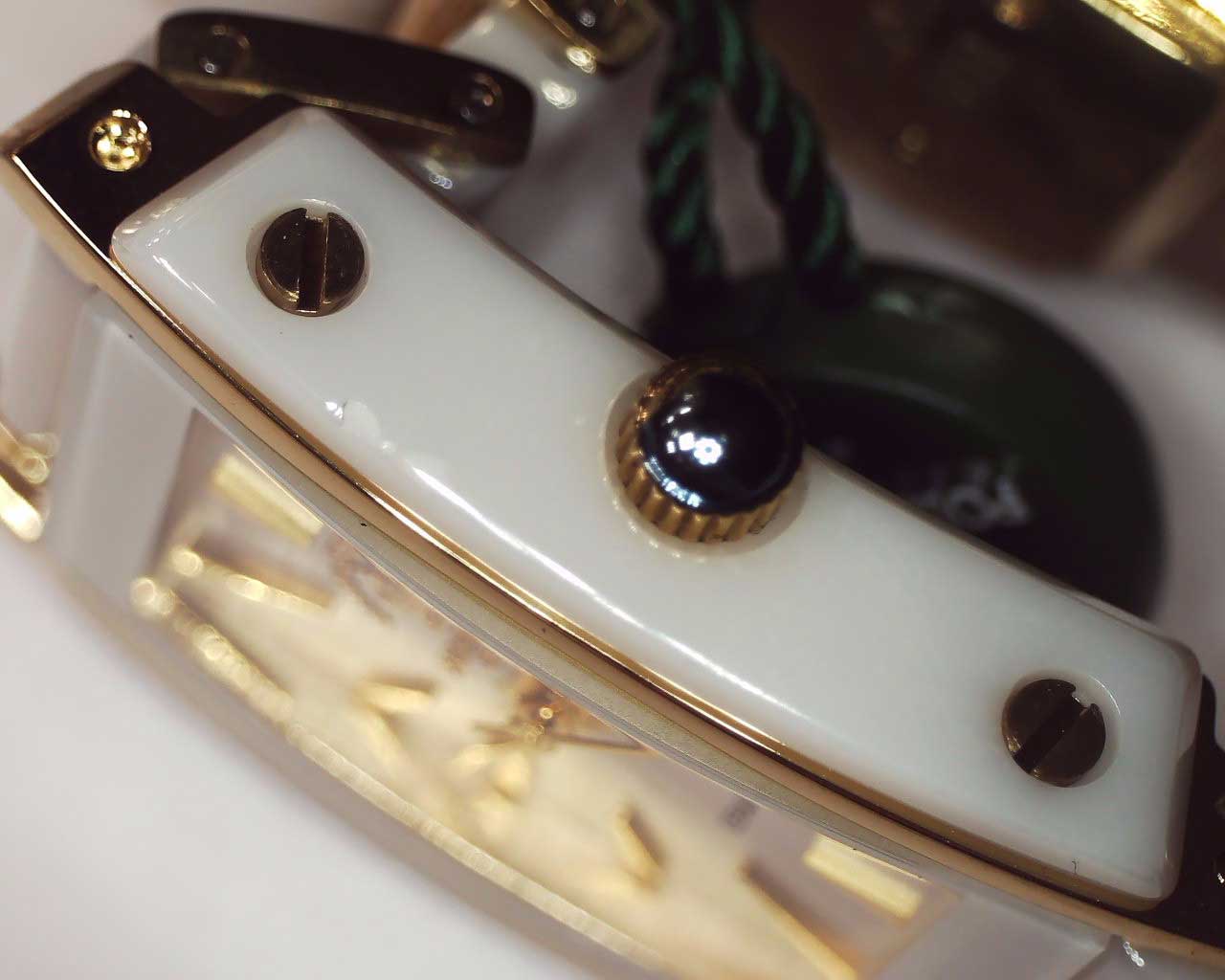 Pair. Женские часы. Прямоугольный керамический корпус. Матовый циферблат украшен фирменным логотипом. Накладные метки в виде штрихов. Острые стрелки в стиле Alpha. Стальной браслет с керамическими вставками. Рифленая заводная головка. Раскладывающаяся застежка.