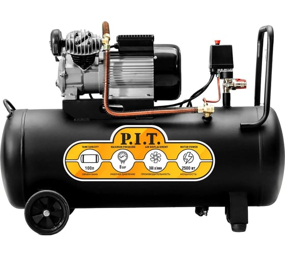 Компрессор электрический масляный P.I.T. (2,5кВт, 3,4лс, 370 л/мин, 100л, 2 цил, 2 вых, евро) PAC100-C1