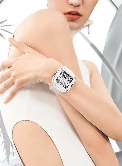 Экстравагантные часы с корпусом из керамики непременно станут настоящим украшением на вашем запястье. Яркие скелетонизированные часы Series X Machina. Закругленный квадратный корпус из керамики изготовленной при 1400°C градусах, за счет чего достигается высокая устойчивость к царапинам. X-образный механизм с частотой 28800 полуколебаний в час. Запас хода 40 часов. Скрытая шкала времени идеально вписывается в корпус часов. Противоположная боковая панель корпуса украшена эксклюзивным логотипом в виде кролика. Заводная головка с защитой. Прозрачная задняя крышка. Ремешок с классической застежкой и системой быстрой замены. Фирменная подарочная упаковка и подставка для часов в форме кролика.
