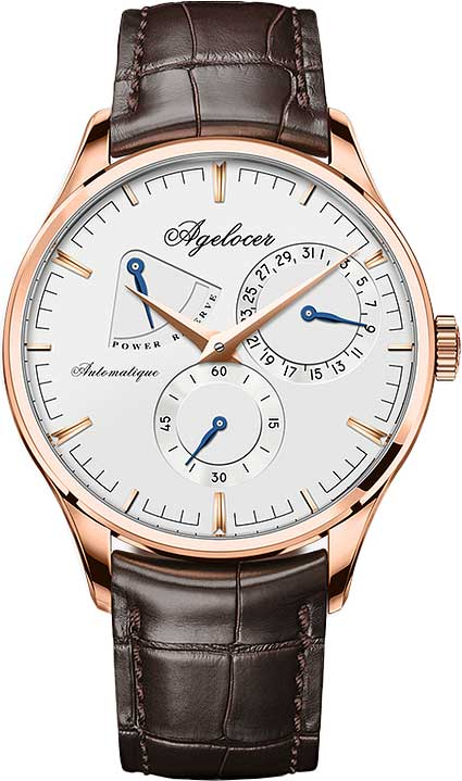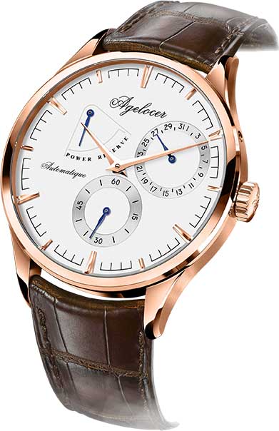 Часы от компании AGELOCER позволят вам чувствовать себя уверенно и комфортно в любой ситуации – на деловой встрече или в повседневной жизни.Мужские часы. Коллекция вдохновлена «Жемчужиной Дуная» Будапештом. В механизме 29 камней,частота 21600 полуколебаний в час. Ретроградный указатель запаса хода до 42 часов. Противоударное устройство оси баланса Incabloc. Механизм часов декорирован узором Cotes de Geneve. Индикация даты и секунд вынесены на отдельные циферблаты. Циферблат с метками в виде штрихов защищен прочным сапфировым стеклом. Заводная головка украшена логотипом Agelocer. Прозрачная задняя крышка. Ремешок с раскладывающейся застежкой и системой быстрой замены.