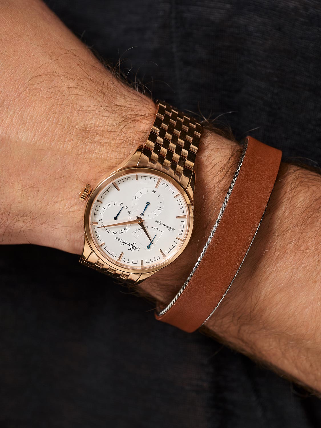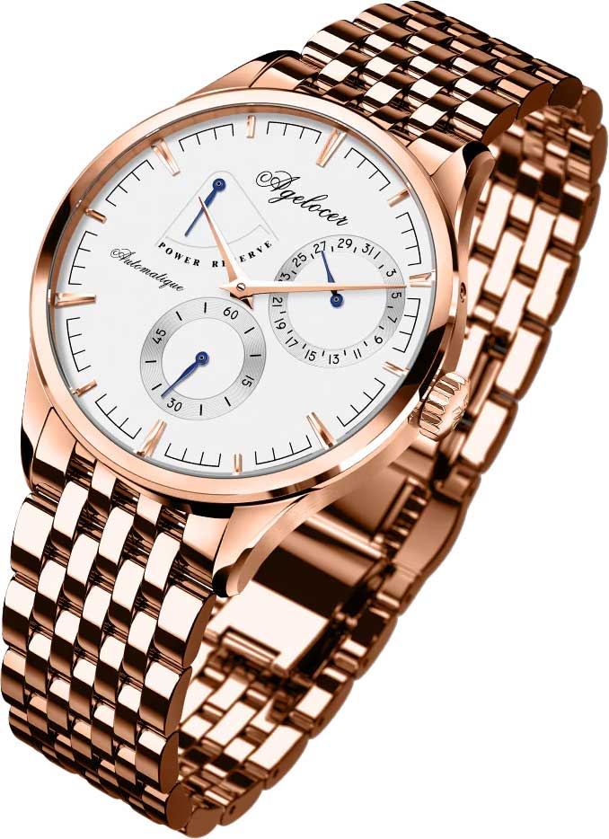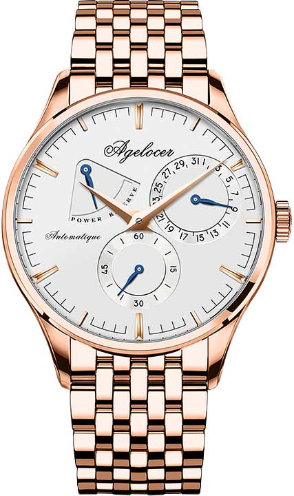 Часы от компании AGELOCER позволят вам чувствовать себя уверенно и комфортно в любой ситуации – на деловой встрече или в повседневной жизни. Мужские часы. Коллекция вдохновлена «Жемчужиной Дуная» Будапештом. В механизме 29 камней, частота 21600 полуколебаний в час. Ретроградный указатель запаса хода до 42 часов. Противоударное устройство оси баланса Incabloc. Механизм часов декорирован узором Cotes de Geneve. Индикация даты и секунд вынесены на отдельные циферблаты. Циферблат с метками в виде штрихов защищен прочным сапфировым стеклом. Заводная головка украшена логотипом Agelocer. Прозрачная задняя крышка. Браслет с раскладывающейся застежкой.
