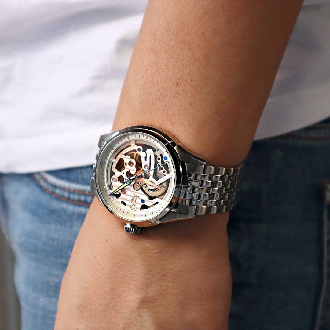 Wall Street Muralist. Скелетонизированные часы. В механизме 20 камней, частота 21600 полуколебаний в час. Запас хода 36 часов. Циферблат с метками в виде штрихов. Рифленая заводная головка. Прозрачная задняя крышка. Браслет с раскладывающейся застежкой.