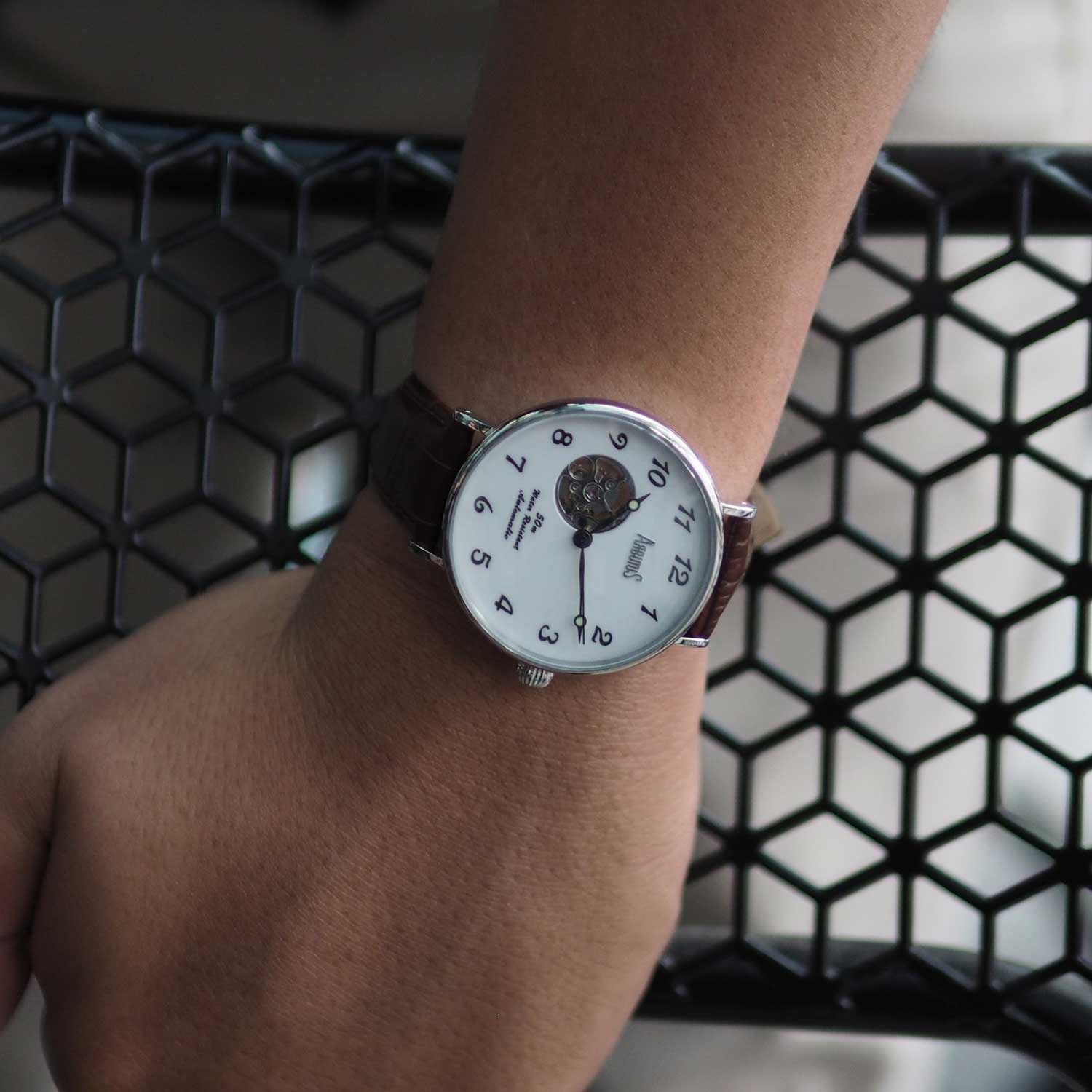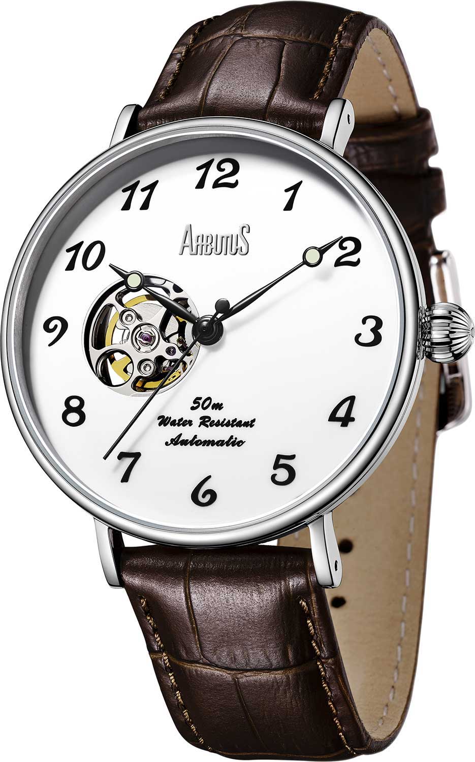 Broadway Back Street. Мужские часы с круглым стальным корпусом. В механизме 24 камня, частота 21600 полуколебаний в час. Запас хода 41 час. Возможность ручного завода. Сквозь прозрачное окошко на циферблате можно наблюдать за работой механизма часов. Керамический циферблат с метками в виде арабских цифр. Прозрачная задняя крышка. Ремешок с классической застежкой.