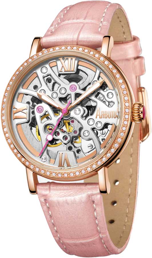 SoHo Maria. Скелетонизированные часы. В механизме 20 камней, частота 21600 полуколебаний в час. Запас хода 36 часов. Циферблат с метками в виде римских цифр. Безель украшен паве из кристаллов. Рифленая заводная головка. Прозрачная задняя крышка. Ремешок с классической застежкой и системой быстрой замены.