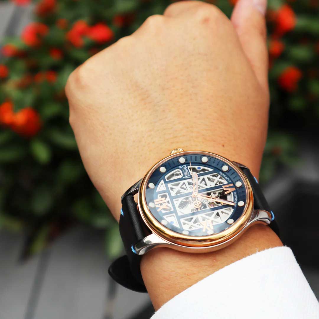 Broadway Tower. Скелетонизированные часы. Многоуровневый циферблат с метками в виде точек и римских цифр. Метки и стрелки с люминесцентным покрытием, которое светится в темноте после непродолжительной зарядки на свету. Рифленая заводная головка. Прозрачная задняя крышка. Ремешок с классической застежкой.