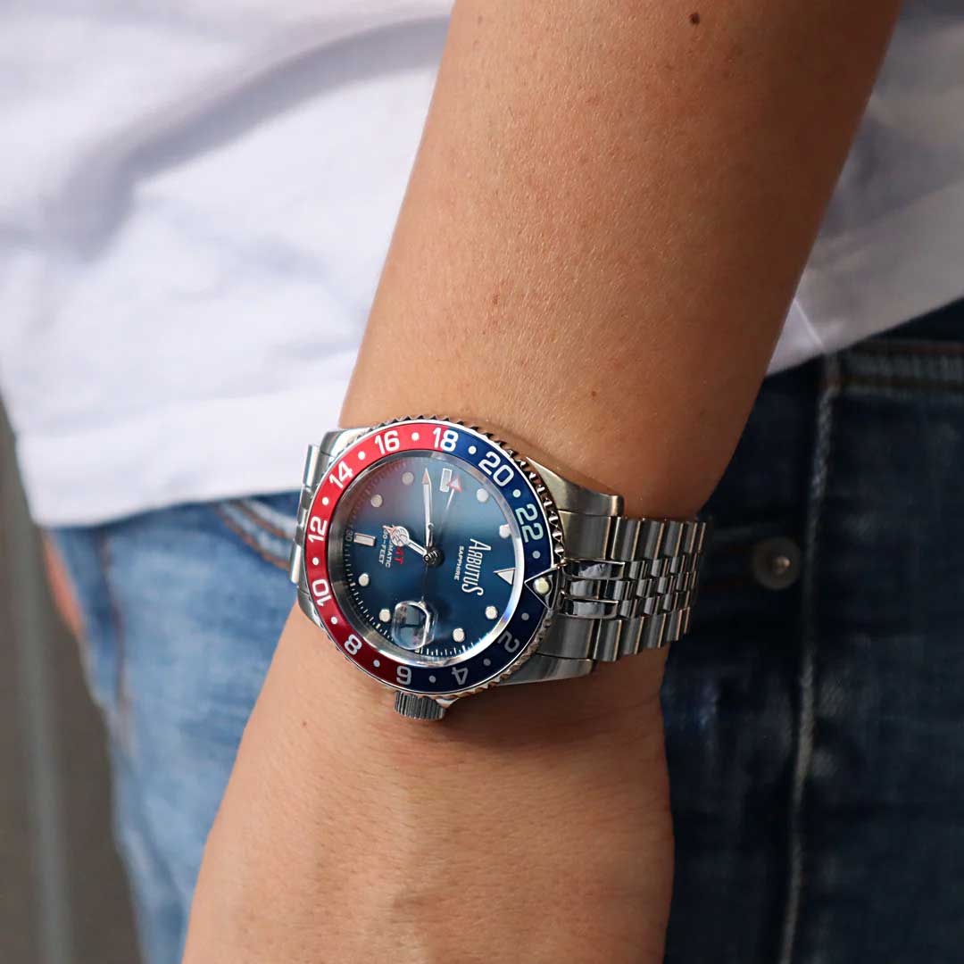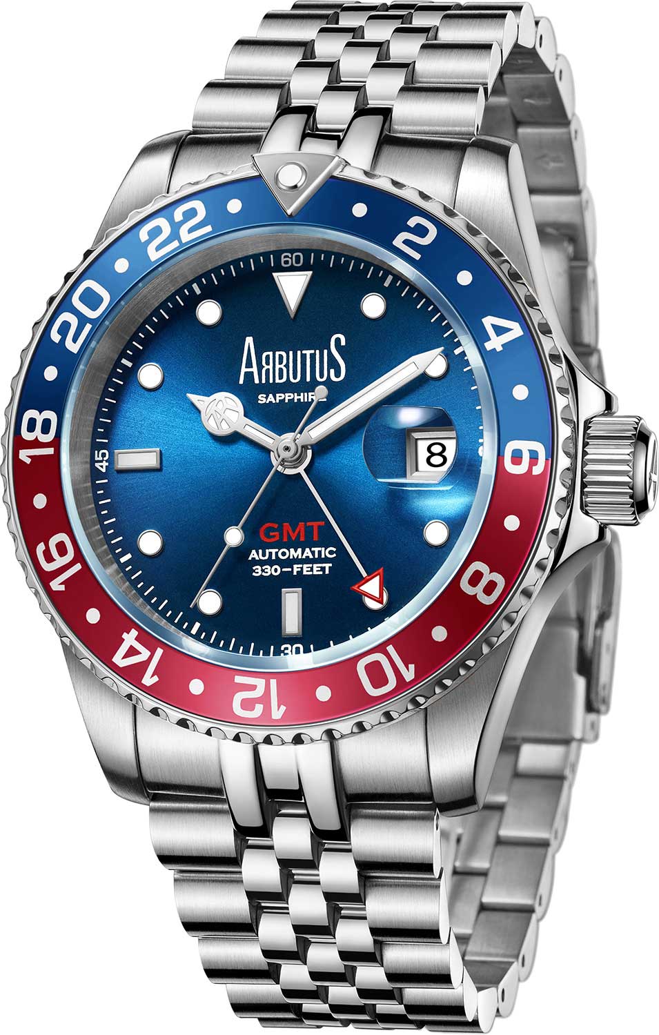 Wall Street Resort. Мужские часы. В механизме 20 камней, частота 21600 полуколебаний в час. Запас хода 36 часов. Второй часовой пояс отображается центральной стрелкой. Циферблат выполнен по технологии Sunray (солнечные лучи) и защищен прочным сапфировым стеклом. Метки в виде точек и штрихов. Метки и стрелки с люминесцентным покрытием, которое светится в темноте после непродолжительной зарядки на свету. Окошко даты с увеличительным стеклом находится в положении 3 часа. Безель с 24-х часовой шкалой вращается в одном направлении. Завинчивающаяся заводная головка с защитой. Прозрачная задняя крышка. Браслет с раскладывающейся застежкой. Застежка с системой блокировки.