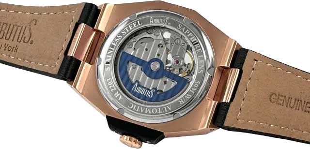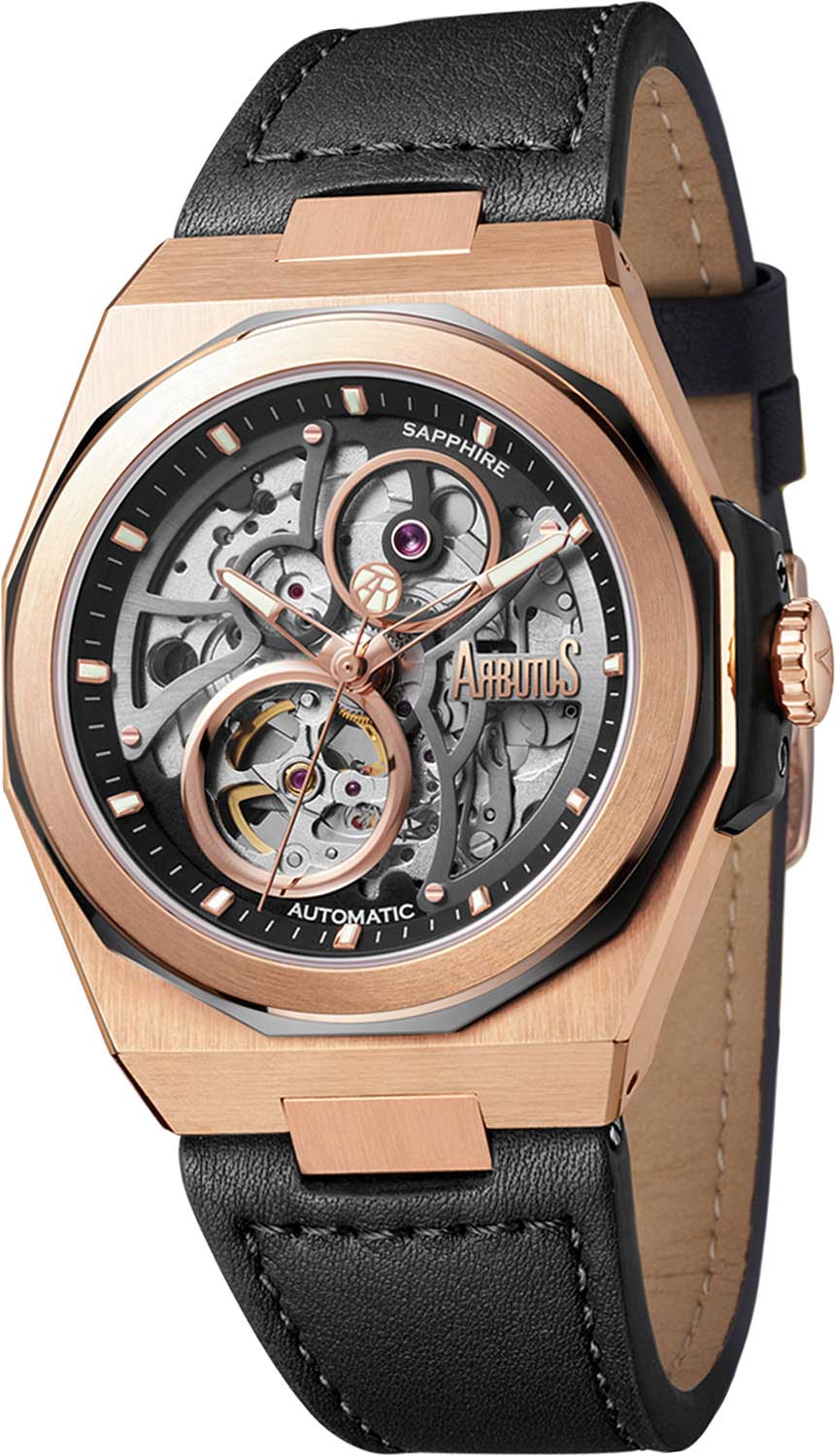 покрытием, которое светится в темноте после непродолжительной зарядки на свету. Граненый безель. Заводная головка с защитой. Прозрачная задняя крышка. Удобный кожаный ремешок с классической застежкой.