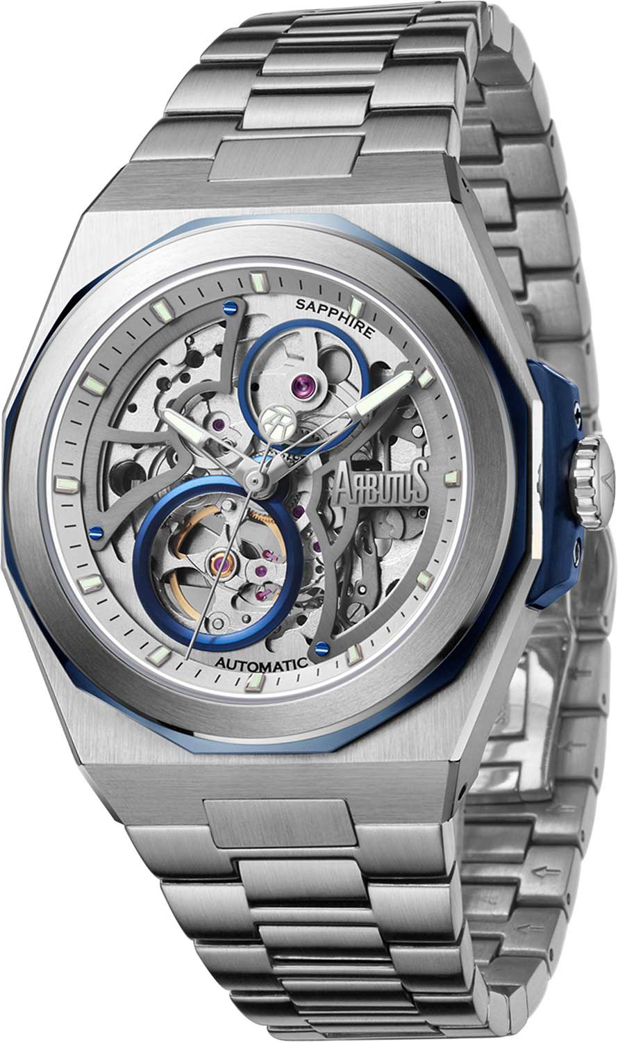 покрытием, которое светится в темноте после непродолжительной зарядки на свету. Граненый безель. Заводная головка с защитой. Прозрачная задняя крышка. Браслет с раскладывающейся застежкой.