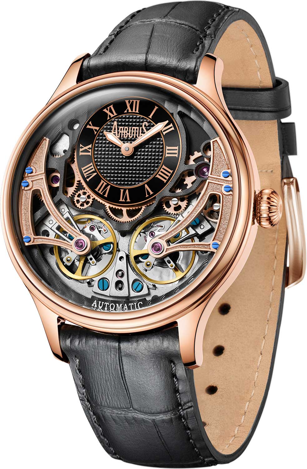 Broadway. Скелетонизированные часы. В механизме 47 камней, частота 21600 полуколебаний в час. Запас хода 36 часов. Многоуровневый циферблат с метками в виде римских цифр. Прозрачная задняя крышка. Ремешок с классической застежкой и системой быстрой замены.
