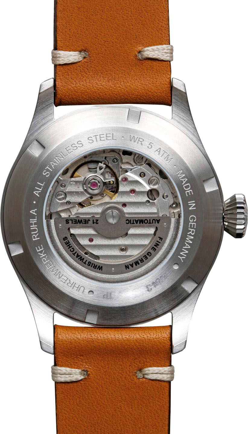 Заостренные прямоугольные стрелки в стиле Baton. Метки и стрелки с люминесцентным покрытием, которое светится в темноте после непродолжительной зарядки на свету. Рифленая, в форме конуса, заводная головка с фирменным логотипом. Завинчивающаяся прозрачная задняя крышка. Удобный кожаный ремешок с декоративной белой строчкой.