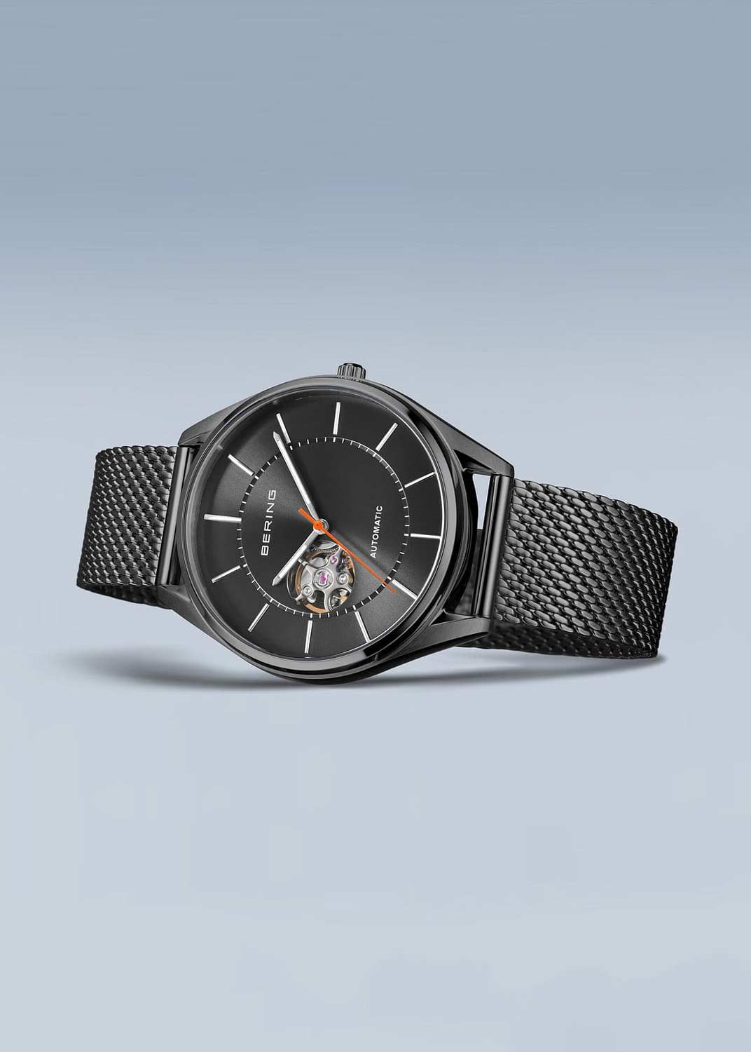 Сквозь прозрачное окошко на циферблате можно наблюдать за работой механизма часов. Рифленая заводная головка. Завинчивающаяся прозрачная задняя крышка. Стальной браслет миланского плетения. Застежка с фиксатором.