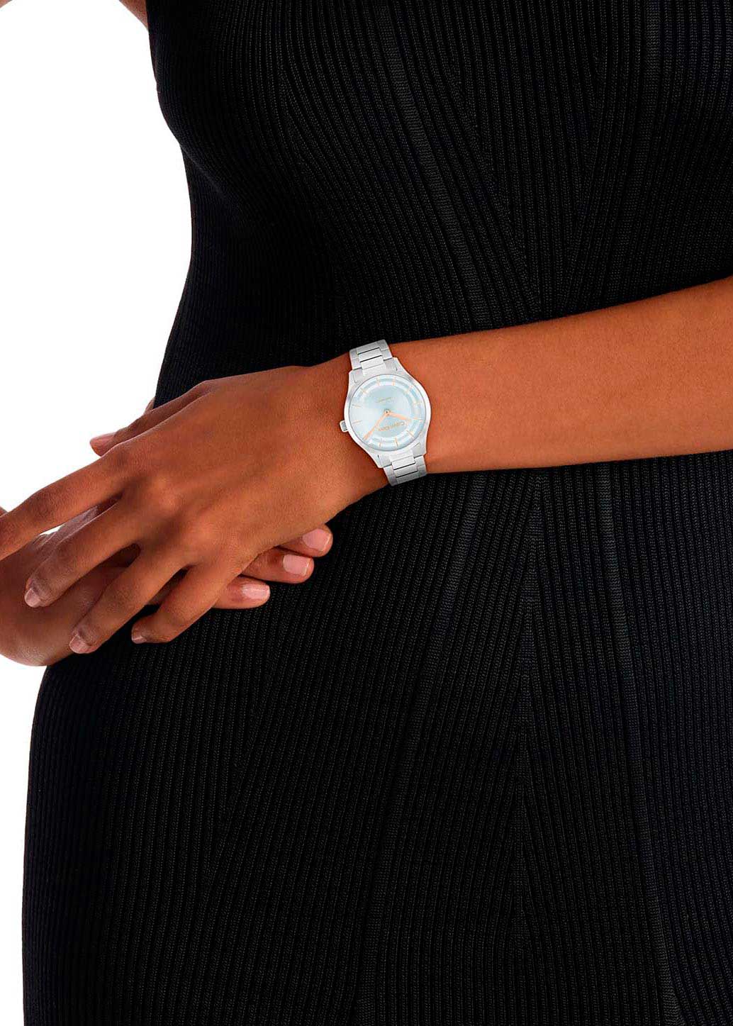 Циферблат выполнен по технологии Sunray (солнечные лучи) и украшен фирменным логотипом Calvin Klein. Накладные метки в виде штрихов. Прямоугольные стрелки в стиле Baton.