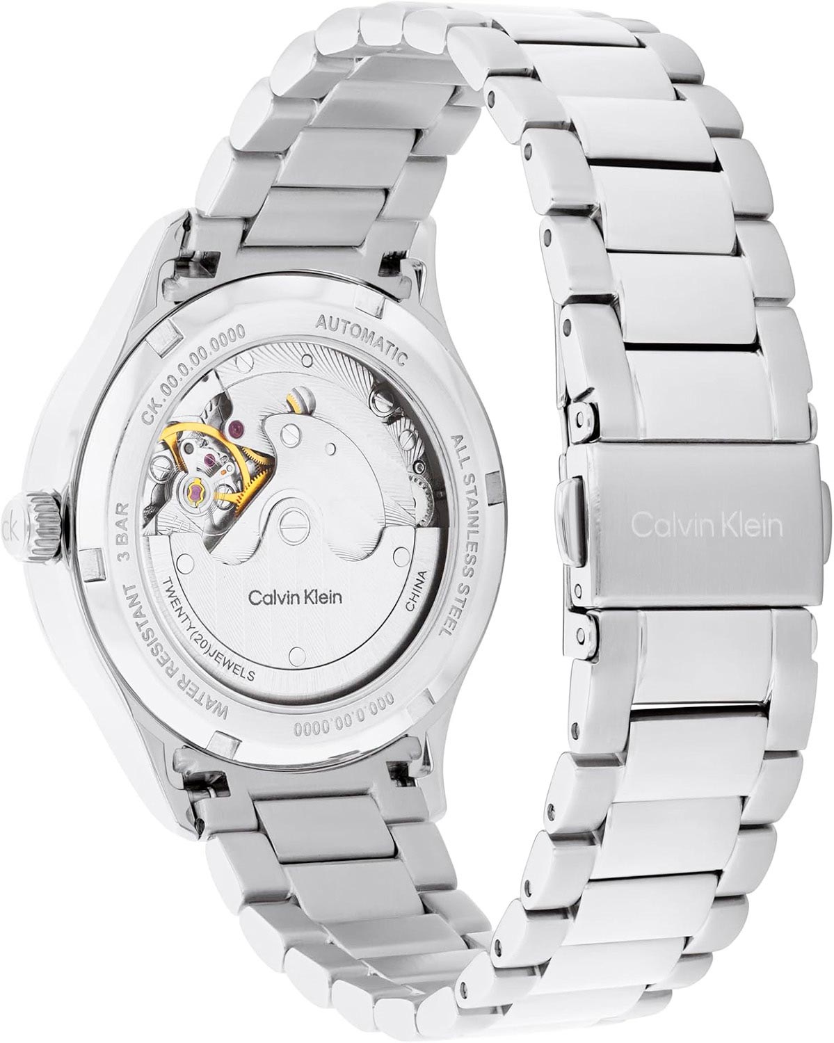 Завинчивающаяся прозрачная задняя крышка. Рифленая заводная головка украшена логотипом ''CK''. Надежный стальной браслет с матовой и полированной отделкой. Раскладывающаяся застежка с двумя кнопками и логотипом бренда Calvin Klein.