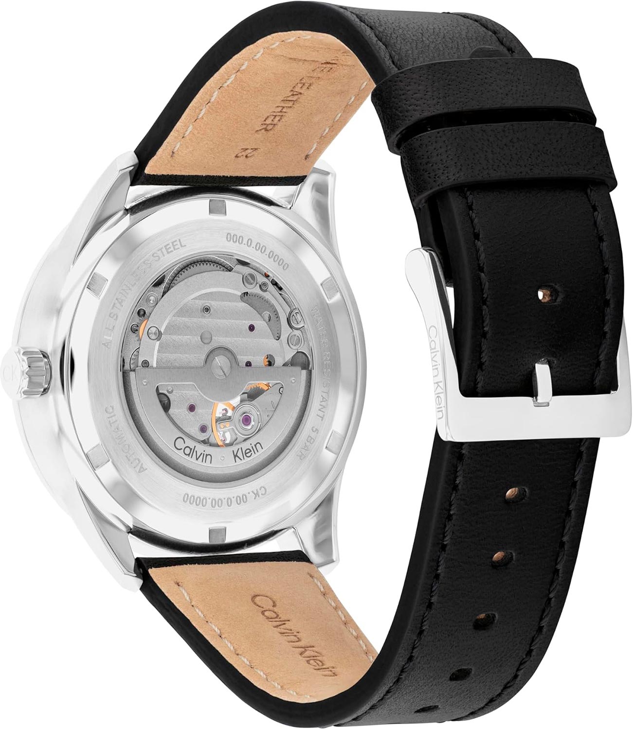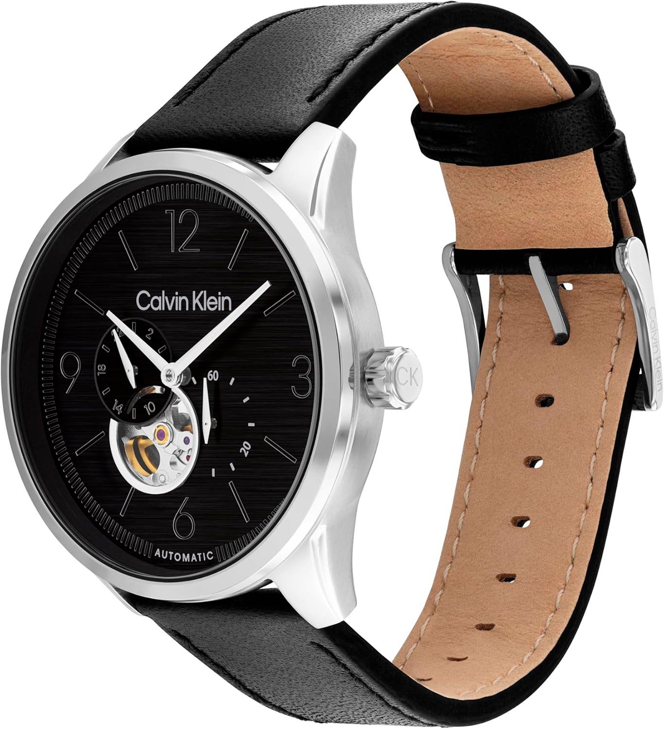 Прямоугольные стрелки в стиле Baton. 12-ти и 24-х часовой формат времени. Секундная стрелка вынесена на отдельный циферблат. Сквозь прозрачное окошко на циферблате можно наблюдать за работой механизма часов. Завинчивающаяся прозрачная задняя крышка. Рифленая заводная головка украшена логотипом ''CK''.