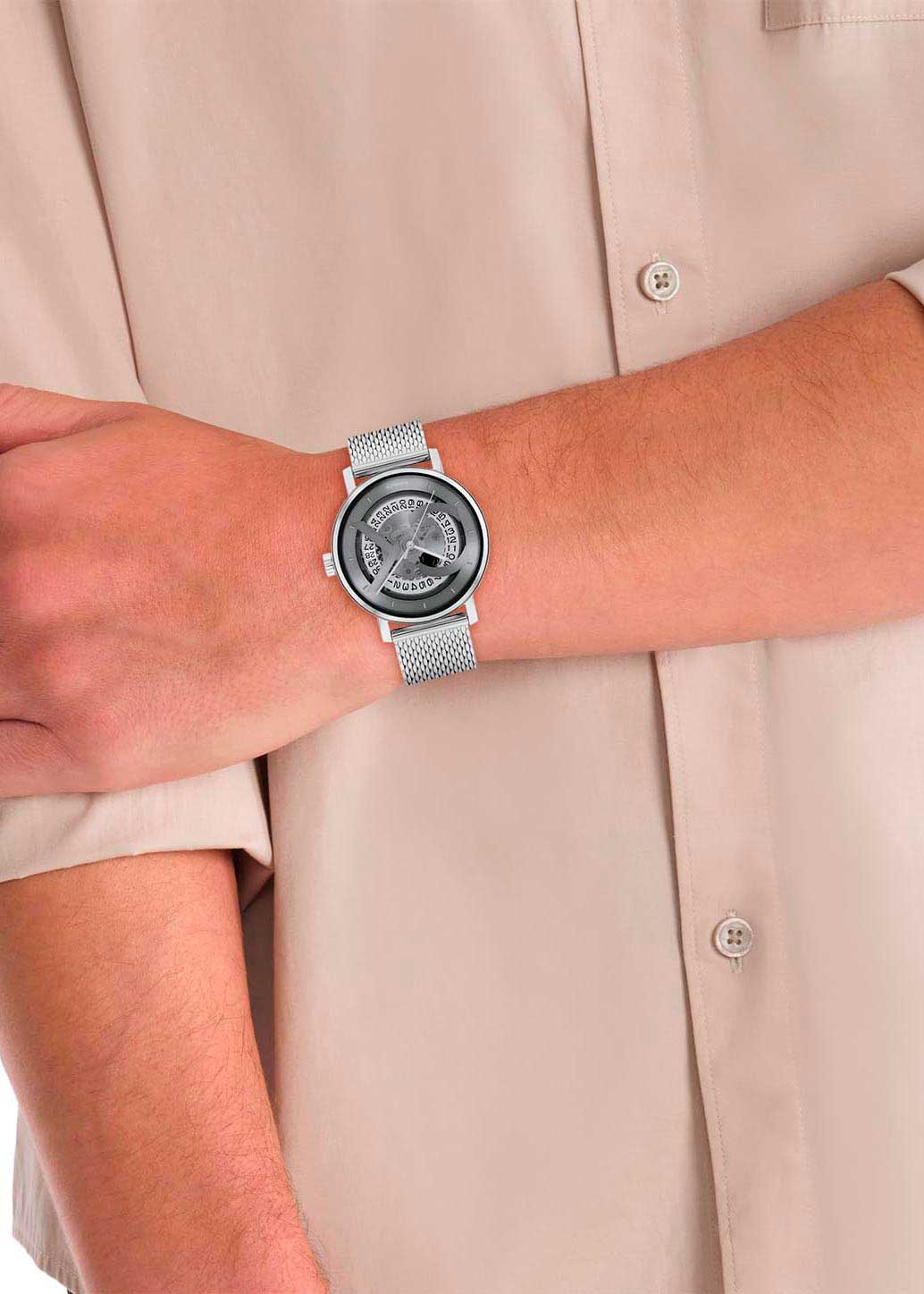 Центральным элементом является вращающийся диск с цифрами — функция отображения даты. Завинчивающаяся прозрачная задняя крышка. Рифленая заводная головка украшена логотипом ''CK''.