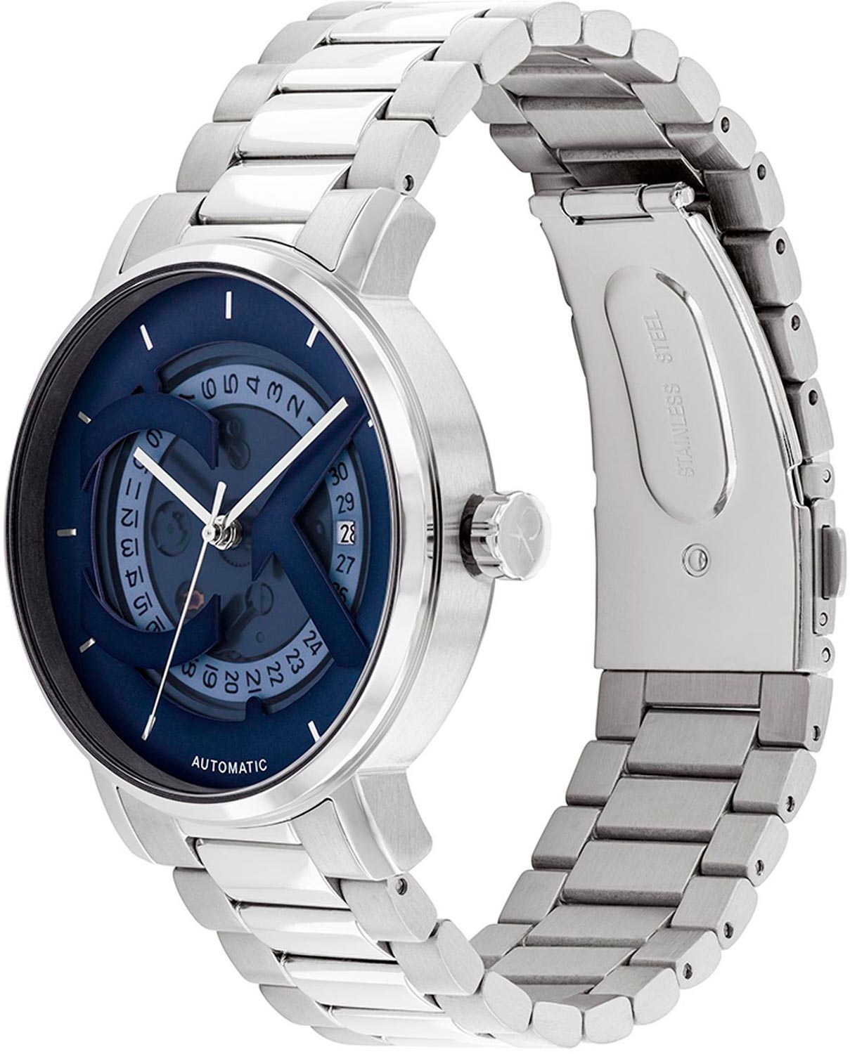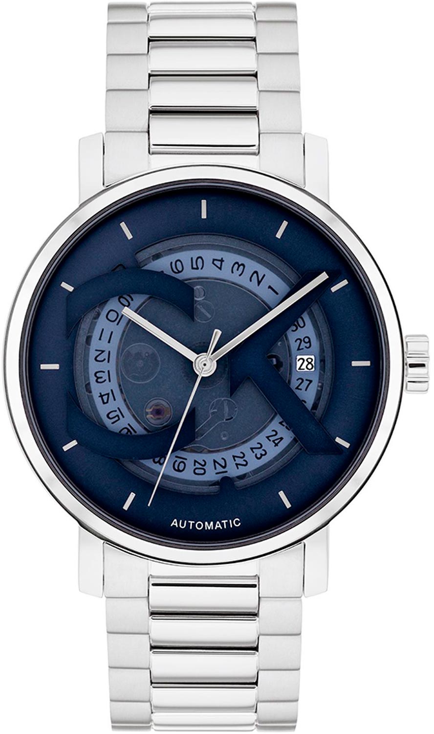 Центральным элементом является вращающийся диск с цифрами — функция отображения даты. Завинчивающаяся прозрачная задняя крышка. Рифленая заводная головка украшена логотипом ''CK''.