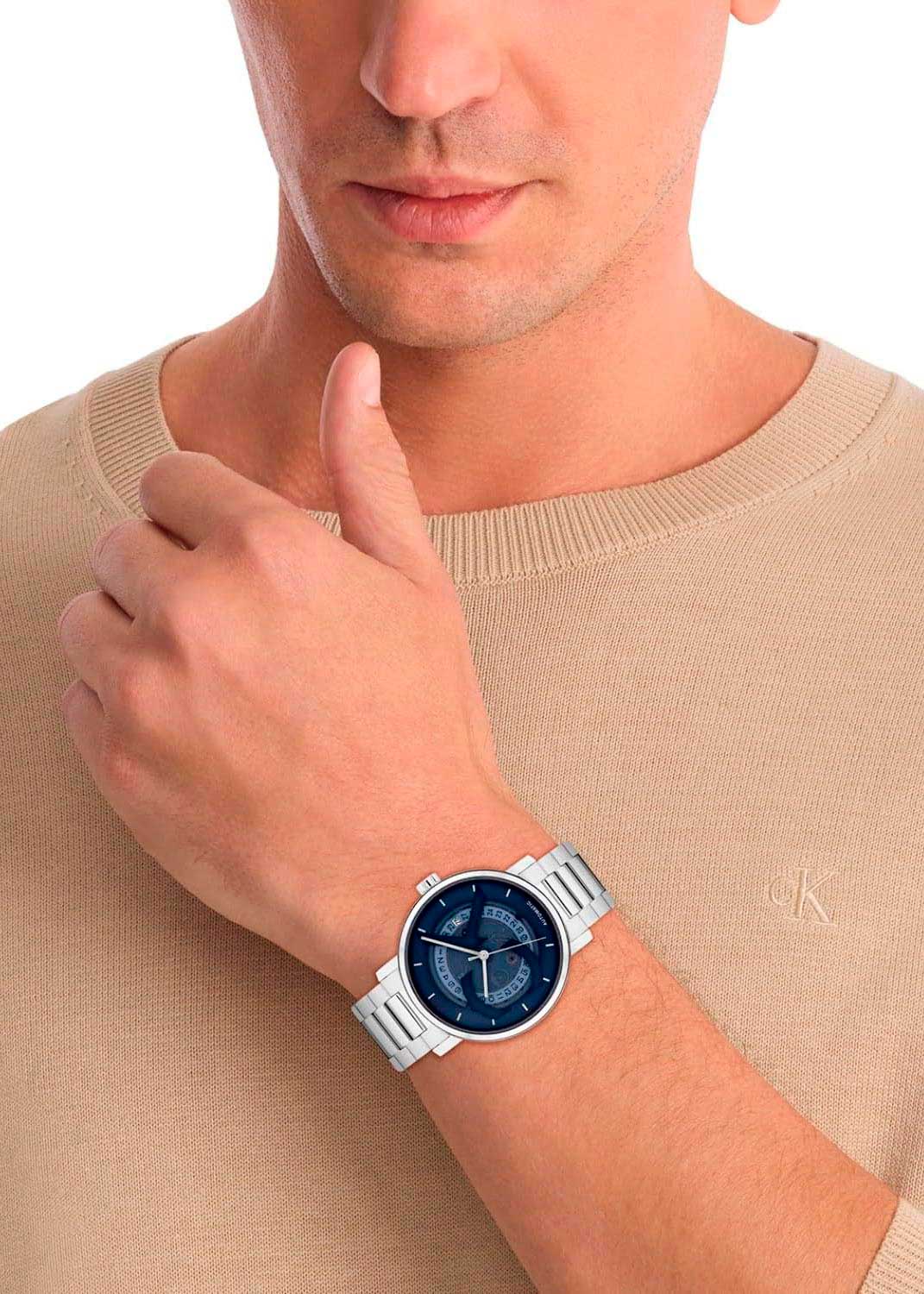 Надежный стальной браслет с матовой и полированной отделкой. Раскладывающаяся застежка с двумя кнопками и логотипом бренда Calvin Klein.