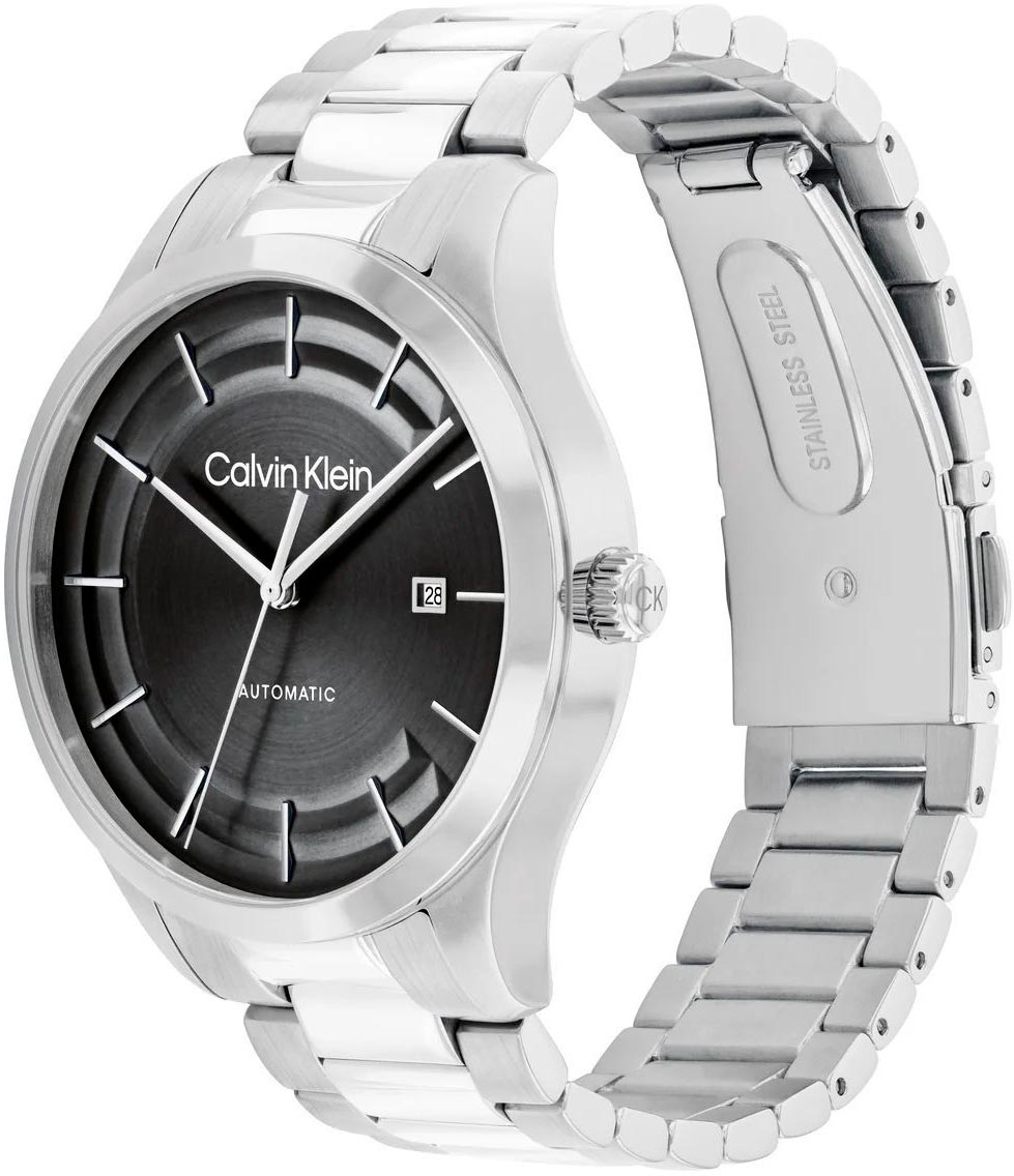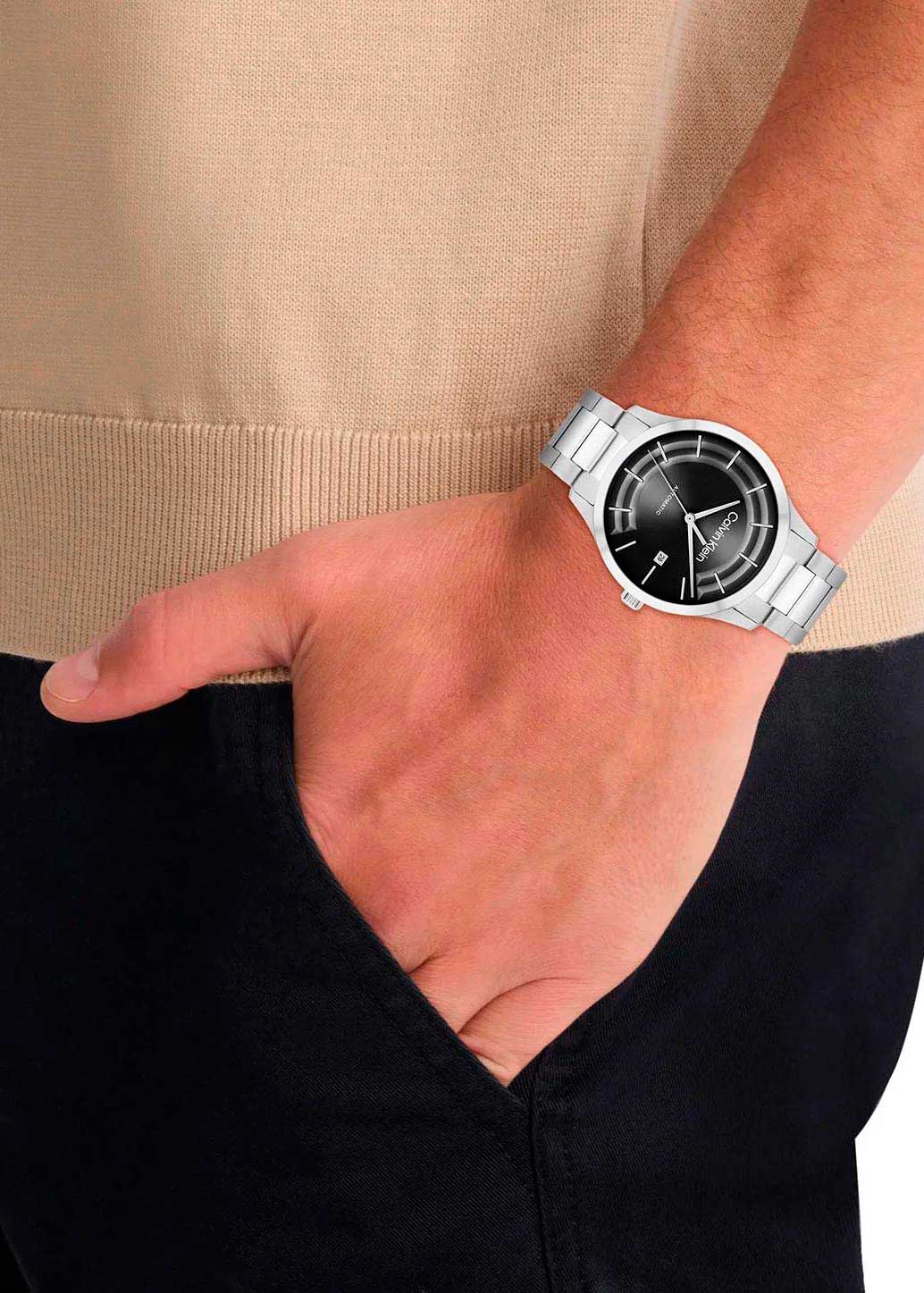 Окошко даты находится в положении 3 часа. Завинчивающаяся прозрачная задняя крышка. Рифленая заводная головка украшена логотипом ''CK''. Надежный стальной браслет с матовой и полированной отделкой. Раскладывающаяся застежка с двумя кнопками и логотипом бренда Calvin Klein.