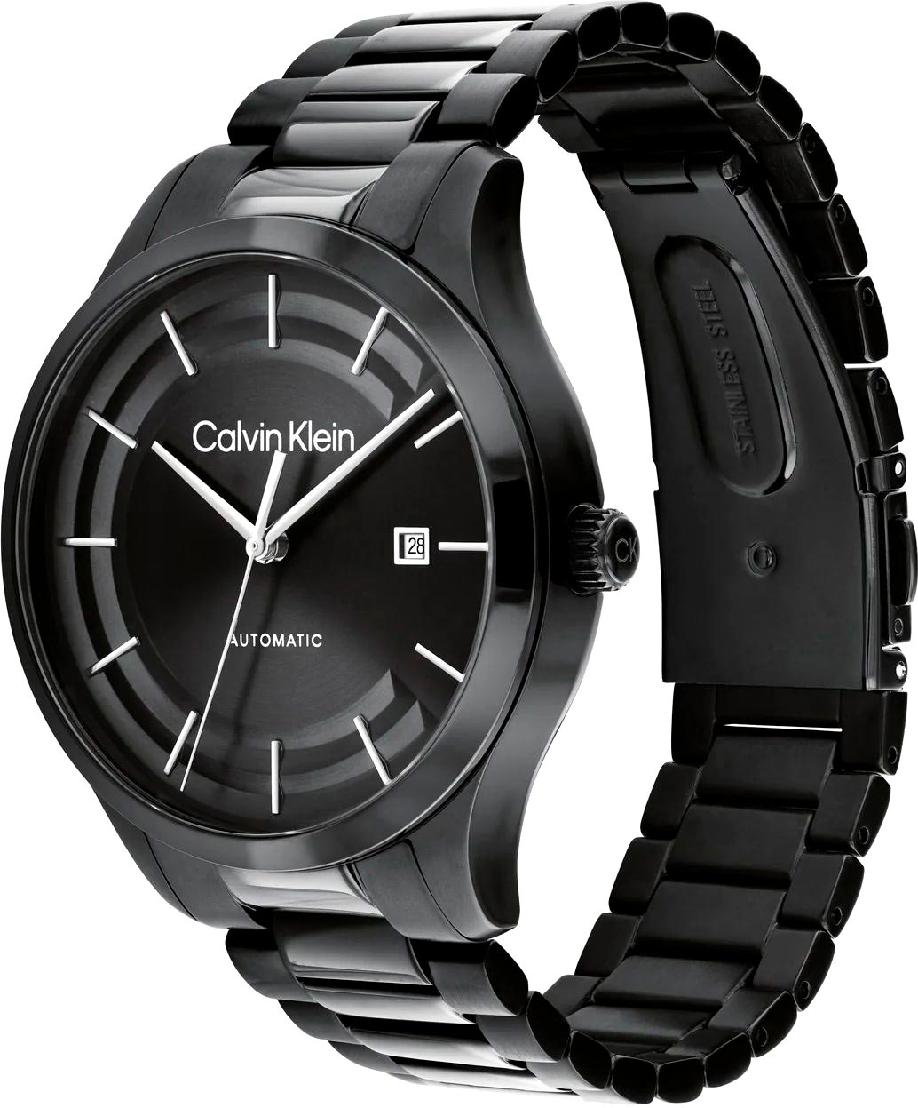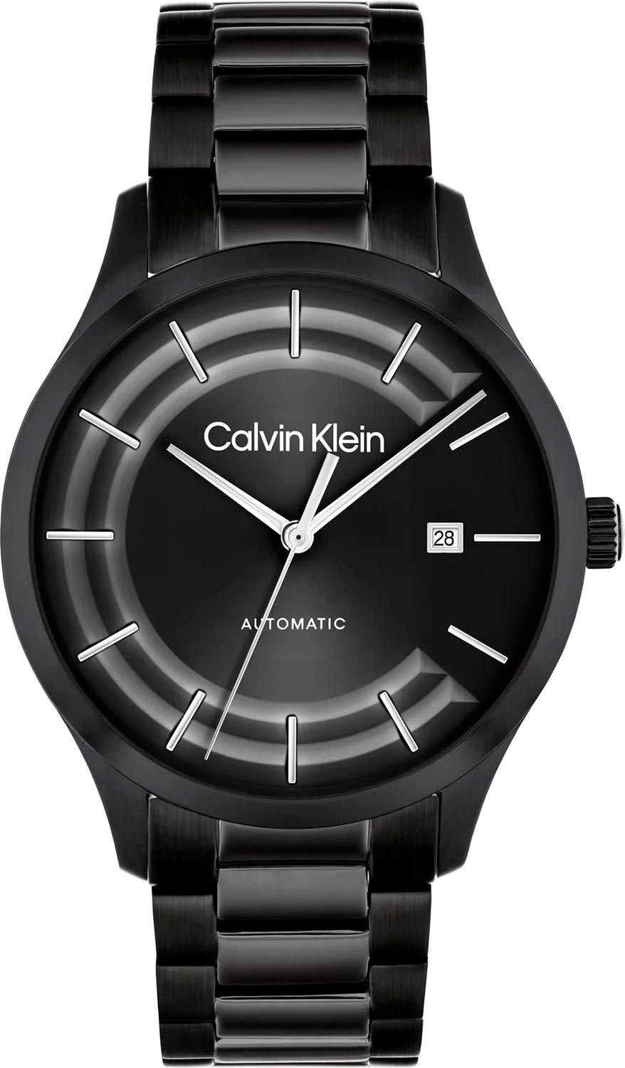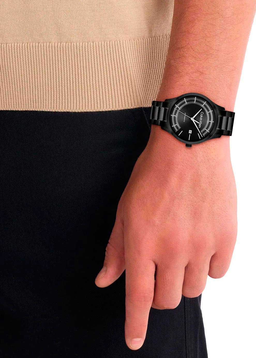 Окошко даты находится в положении 3 часа. Завинчивающаяся прозрачная задняя крышка. Рифленая заводная головка украшена логотипом ''CK''. Надежный стальной браслет с матовой и полированной отделкой. Раскладывающаяся застежка с двумя кнопками и логотипом бренда Calvin Klein.