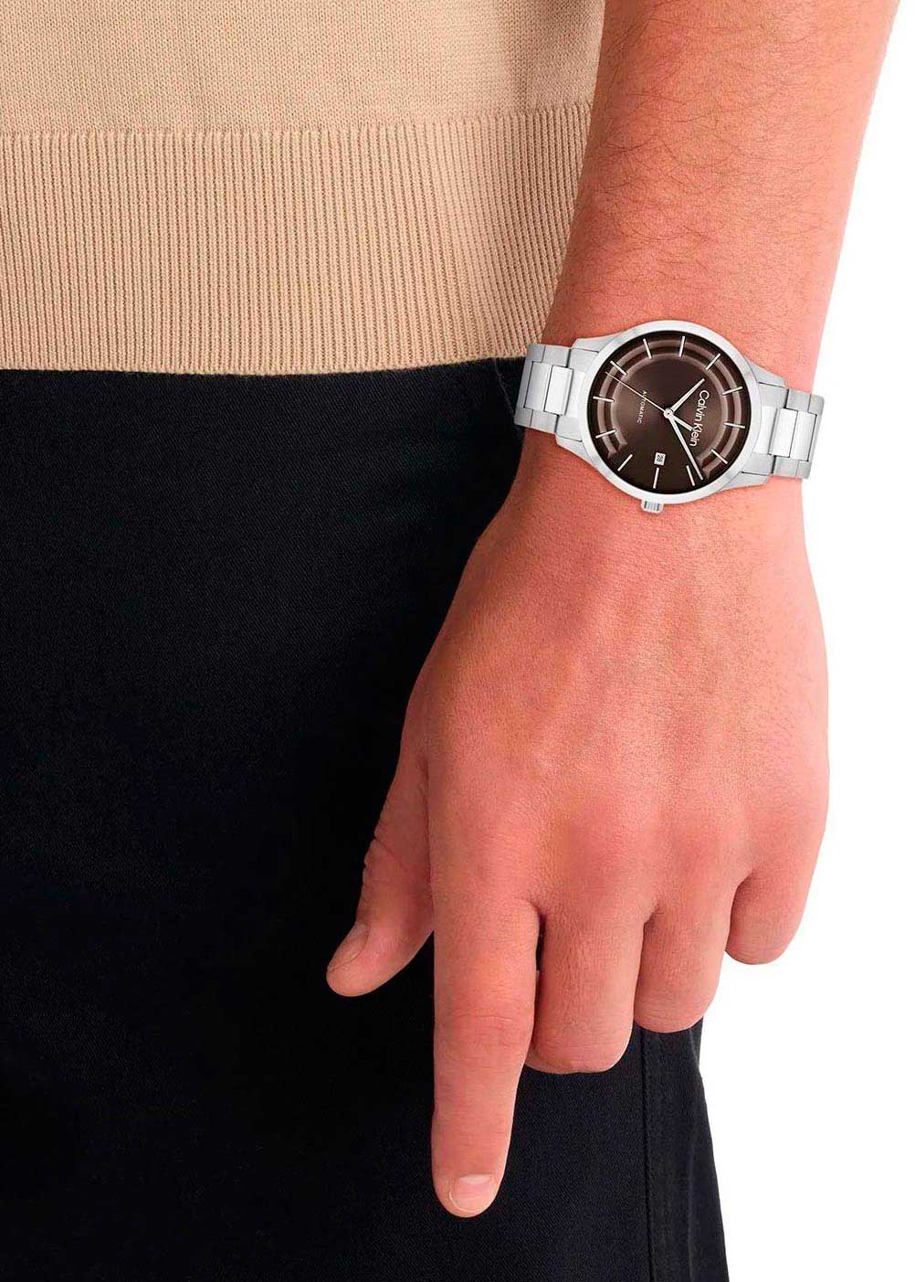 Окошко даты находится в положении 3 часа. Завинчивающаяся прозрачная задняя крышка. Рифленая заводная головка украшена логотипом ''CK''. Надежный стальной браслет с матовой и полированной отделкой. Раскладывающаяся застежка с двумя кнопками и логотипом бренда Calvin Klein.