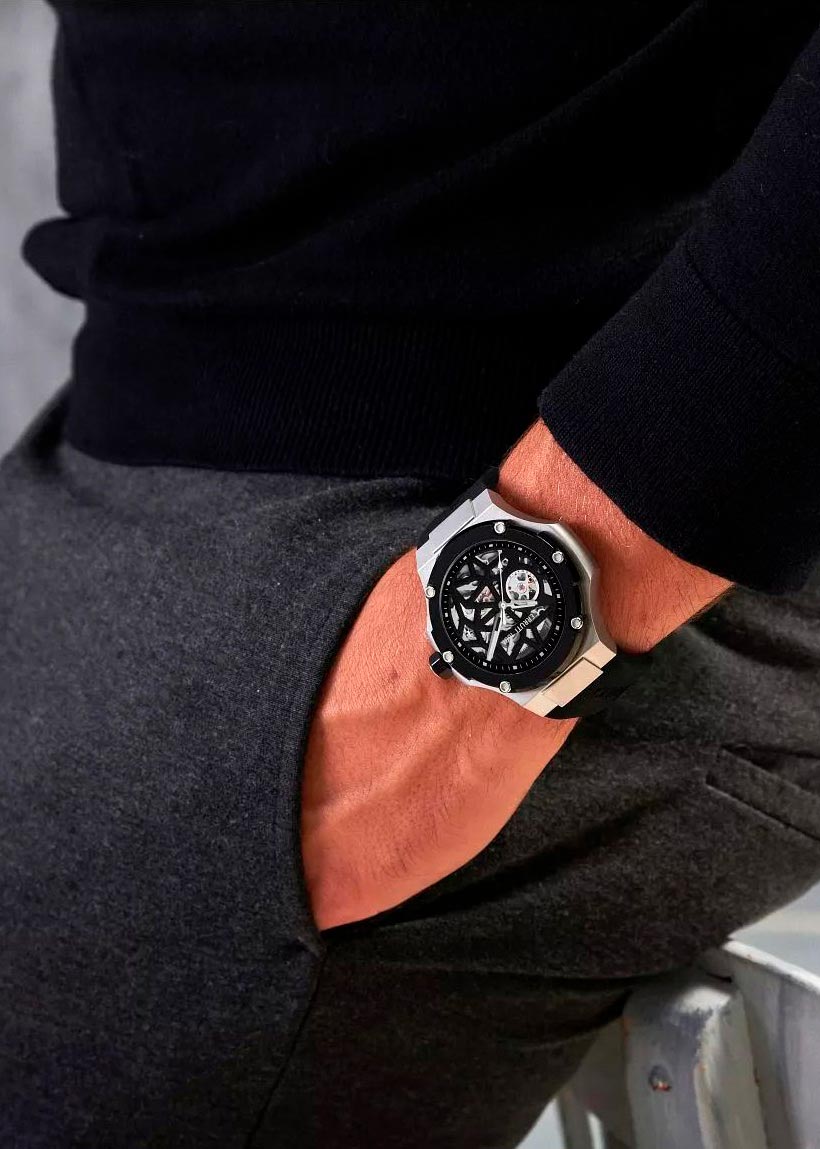 Автоматические мужские наручные часы Lucardo Automatic. Круглый стальной корпус с пескоструйной и полированной отделкой. Накладной безель с декоративными болтами. Прозрачный циферблат с узором. Метки в виде точек.