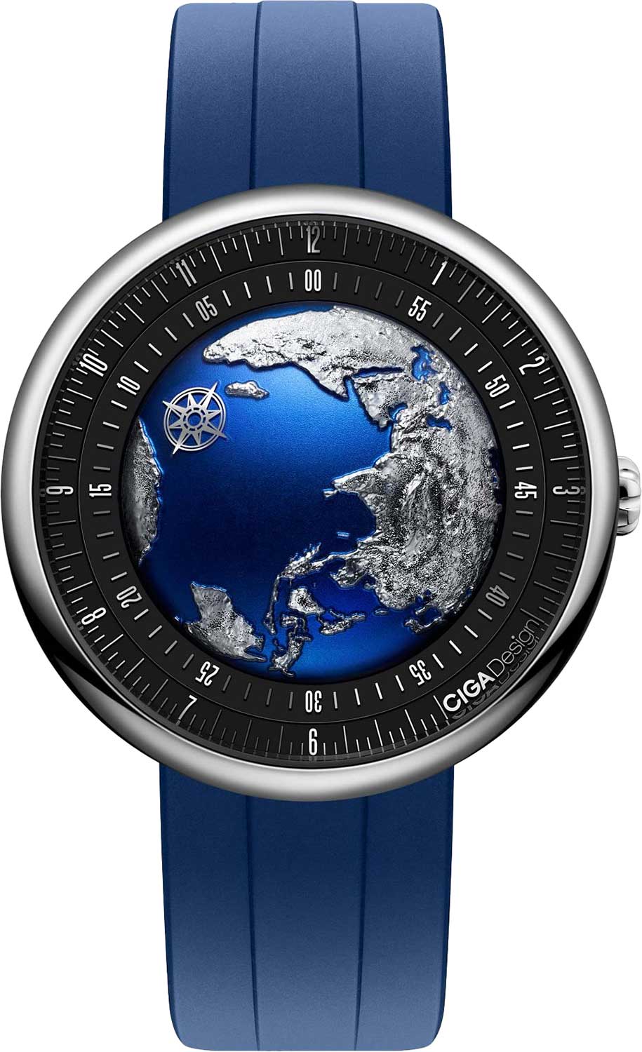 Минутное кольцо не вращается каждый час, а поворачивается на 360 градусов каждые 60 минут, чтобы совпасть с индикатором часов. Таким образом, время считывается только в одном месте, с помощью единственного указателя — компасной розы, указывающей часы и минуты. Часовая и минутная стрелки выравниваются в любое время суток.