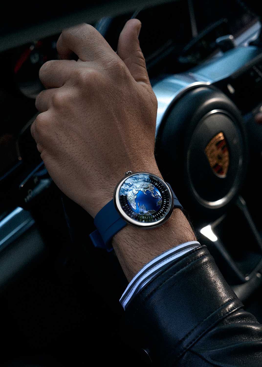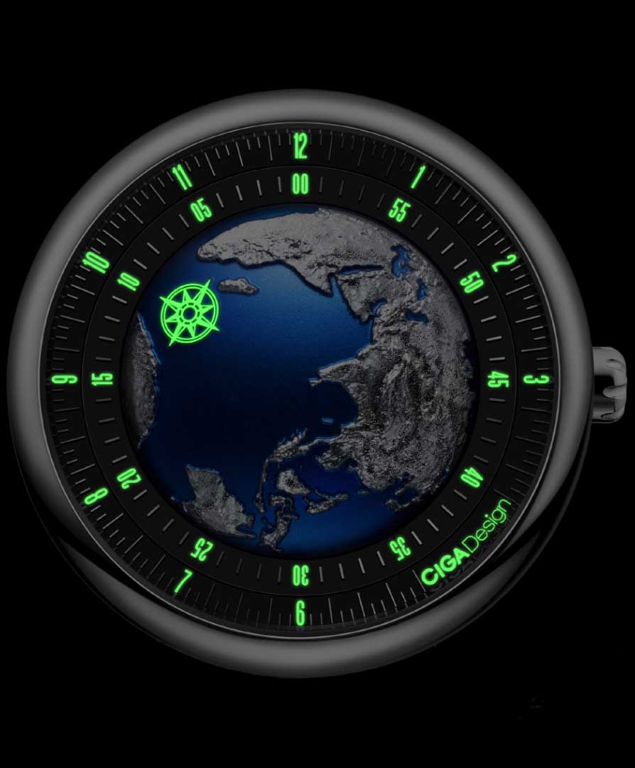 Центральная часть многослойного циферблата представляет собой куполообразную алюминиевую конструкцию с рельефным изображением континентов, окружающих Индийский океан. Вся эта секция вращается с течением времени. Вокруг глобуса расположено вращающееся кольцо для минут и неподвижное кольцо для часов.