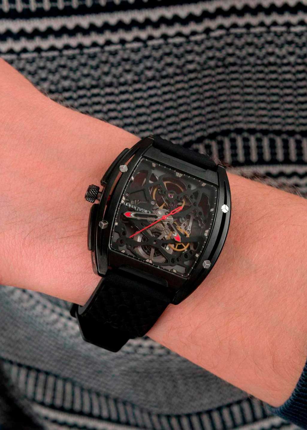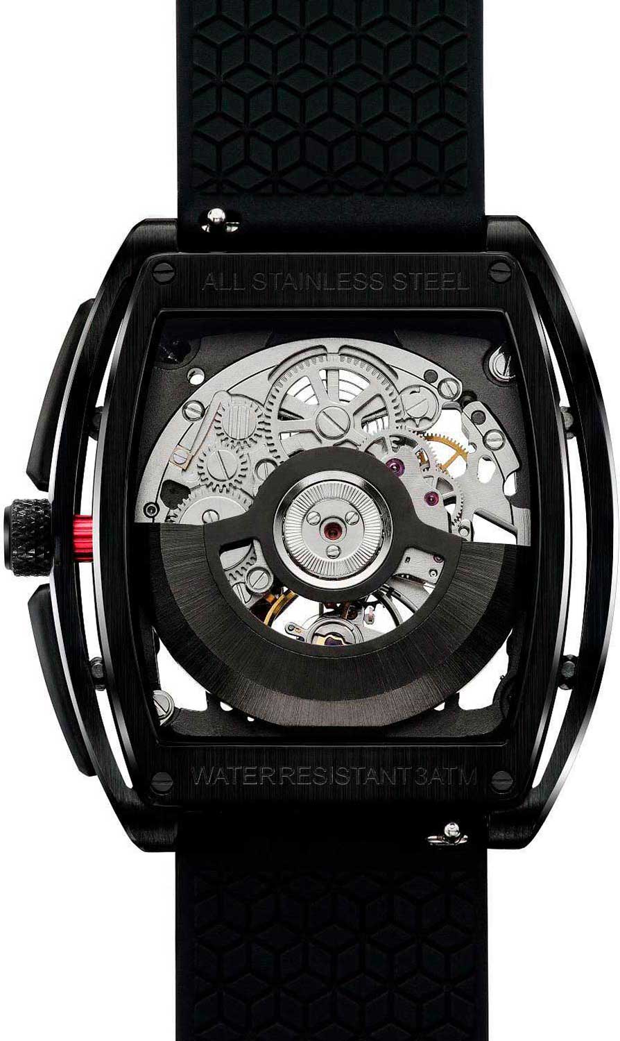 Скелетонизированные часы Z-Series. Стальной корпус особой бочкообразной формы. Оригинальные шестигранные винты маскируют прочный крепеж. В механизме 25 камней, частота 21600 полуколебаний в час. Запас хода 40 часов. С вращением шестеренок можно видеть каждую секунду и ощутить единство механики со временем.