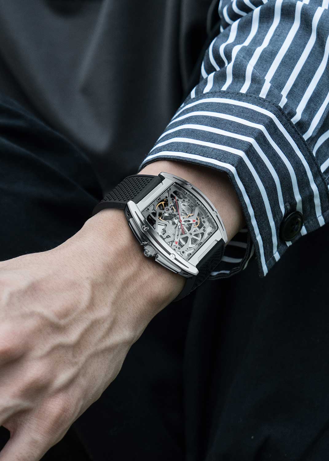 Скелетонизированные часы Z-Series. Стальной корпус особой бочкообразной формы. Оригинальные шестигранные винты маскируют прочный крепеж. В механизме 25 камней, частота 21600 полуколебаний в час. Запас хода 40 часов. С вращением шестеренок можно видеть каждую секунду и ощутить единство механики со временем.