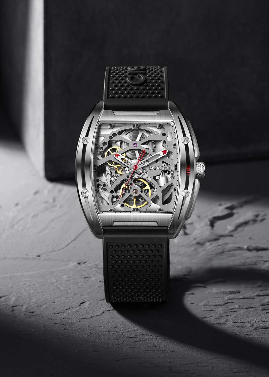 Цельная шкала циферблата на внутренней стороне корпуса. Ажурные стрелки с яркими акцентами. Прозрачная задняя крышка крепится на 4-х винтах. Заводная головка с защитой. Силиконовый ремешок с классической застежкой имеет функцию быстрой замены.