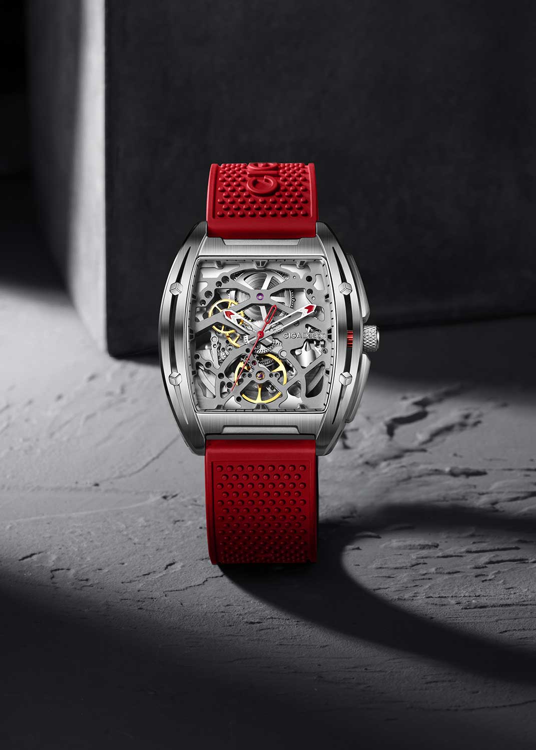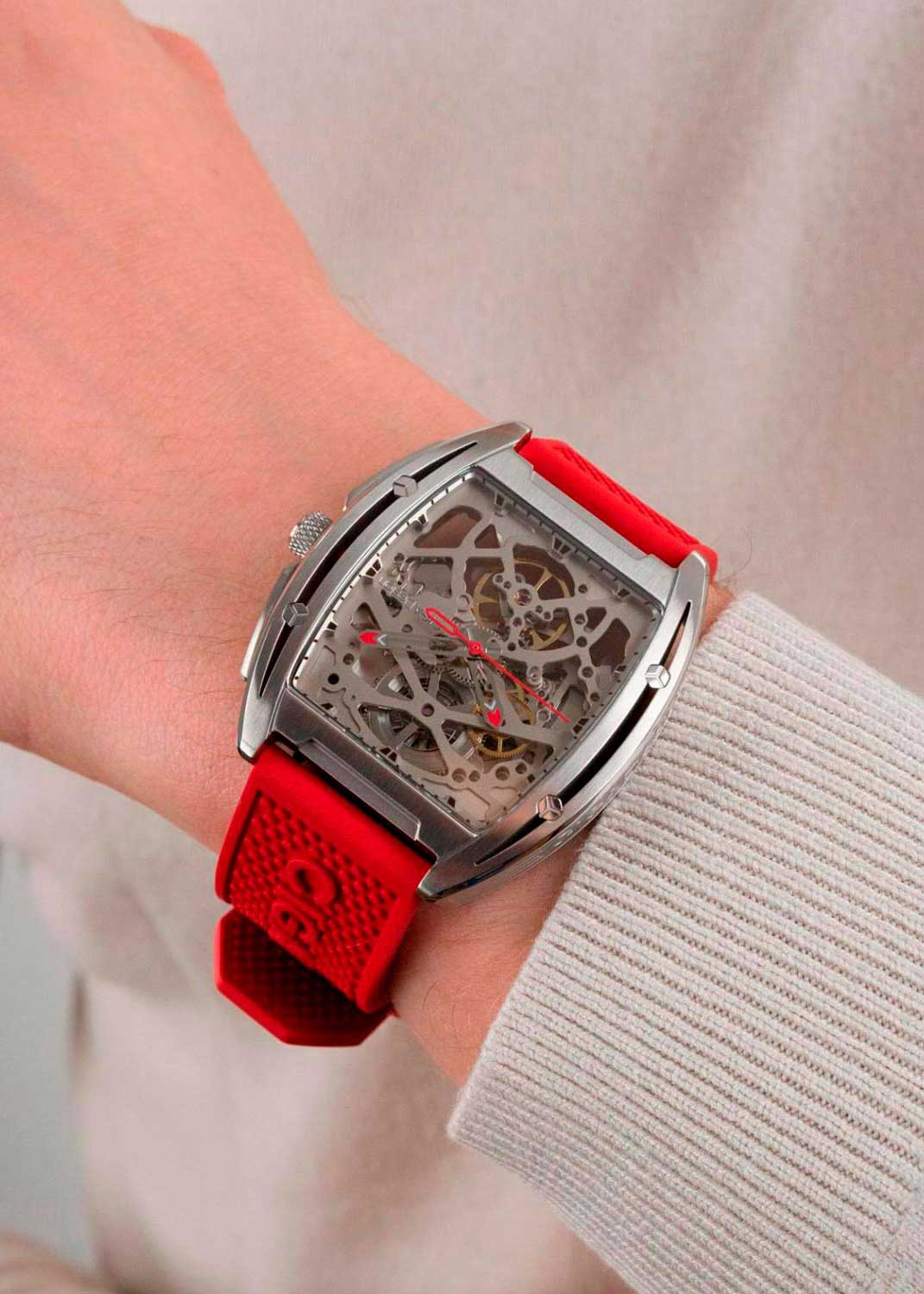 Цельная шкала циферблата на внутренней стороне корпуса. Ажурные стрелки с яркими акцентами. Прозрачная задняя крышка крепится на 4-х винтах. Заводная головка с защитой. Силиконовый ремешок с классической застежкой имеет функцию быстрой замены.