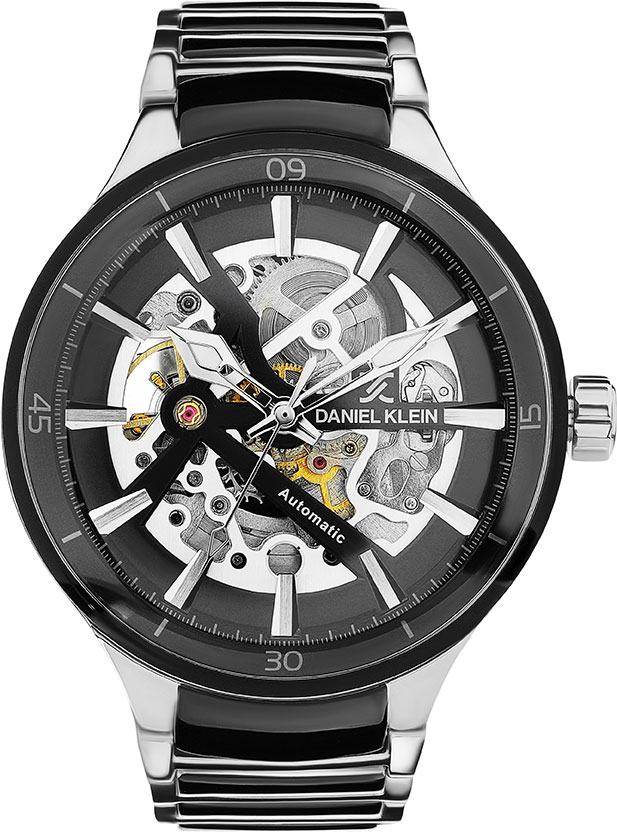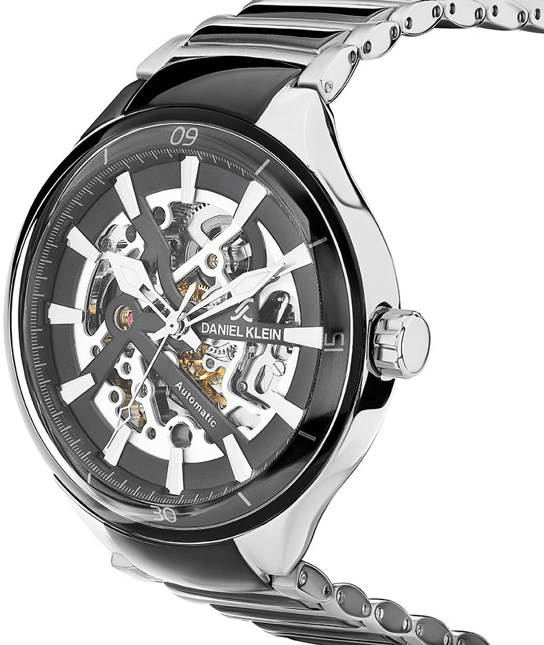 Оригинальные часы-скелетоны идеально подойдут тем мужчинам, которые хотят ярко выразить себя. Мужские механические скелетонизированные часы с автоподзаводом. Круглый металлический корпус с IP покрытием. Стеклянный безель. Циферблат украшен фирменным логотипом Daniel Klein в положении 3 часа и защищен минеральным стеклом. Метки в виде штрихов. Контурные стрелки в стиле Skeleton с люминесцентным покрытием, которое светится в темноте после непродолжительной зарядки на свету. По краю циферблата нанесена секундная шкала с шагом 0,2 секунды. Частично полированный и сатинированный стальной браслет с частичным черным IP покрытием и раскладывающейся застежкой.