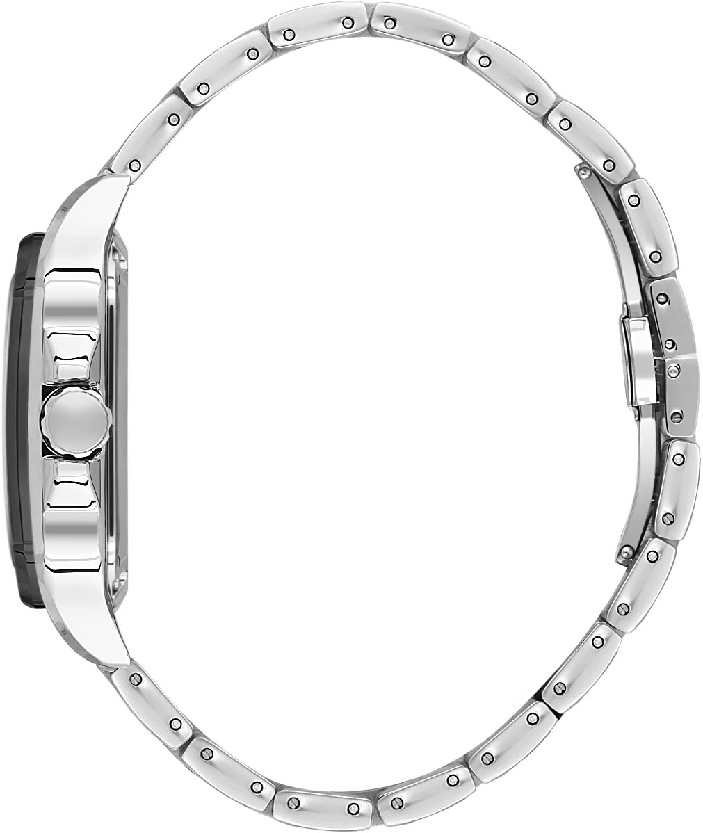 Мужские механические скелетонизированные часы с автоподзаводом. Прямоугольный металлический корпус с IP покрытием. Метки в виде штрихов. Заводная головка с защитой. Частично полированный и сатинированный стальной браслет с раскладывающейся застежкой.