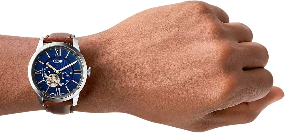 Уникальное сочетание классики и современности - лучший выбор для уверенных в себе мужчин. Townsman Automatic Brown Leather Watch. Наручные часы с круглым стальным корпусом. 12-ти и 24-х часовой формат времени. Циферблат с метками в виде штрихов и римских цифр. Секундная стрелка вынесена на отдельный циферблат. Сквозь прозрачное окошко на циферблате можно наблюдать за работой механизма часов. Прозрачная задняя крышка. Рифленая заводная головка. Кожаный ремешок с классической застежкой.