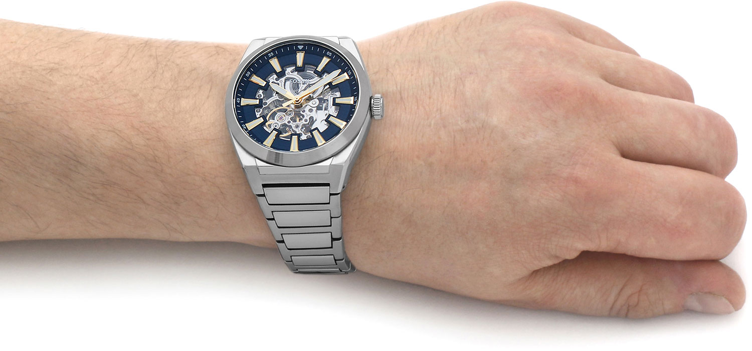 Открытый циферблат позволит вам насладиться отточенной работой часового механизма. Everett. Скелетонизированные часы. В механизме 21 камень. Метки в виде штрихов. Прозрачная задняя крышка. Рифленая заводная головка. Надежный стальной браслет с раскладывающейся застежкой.