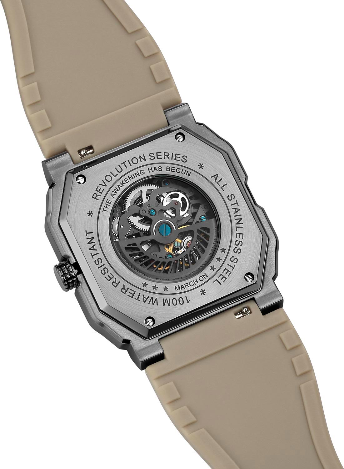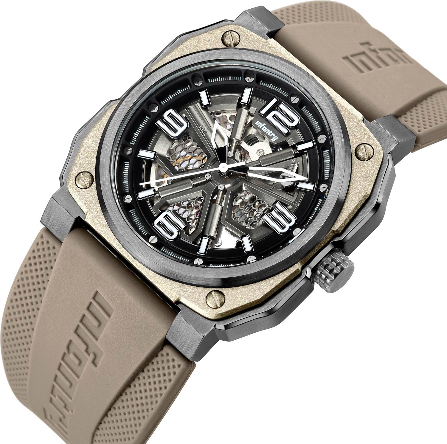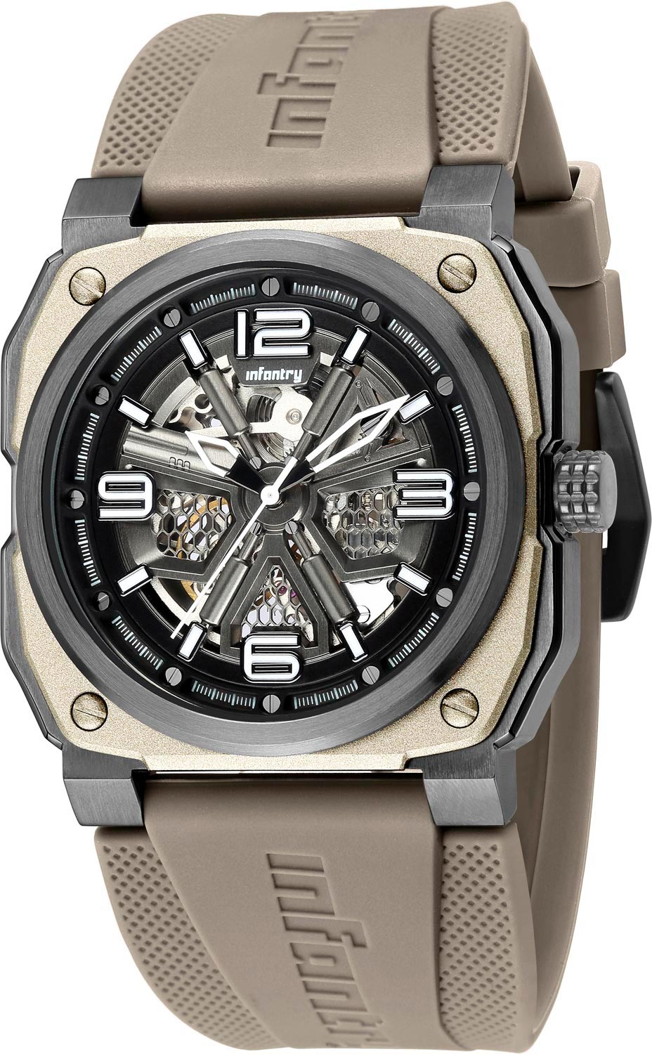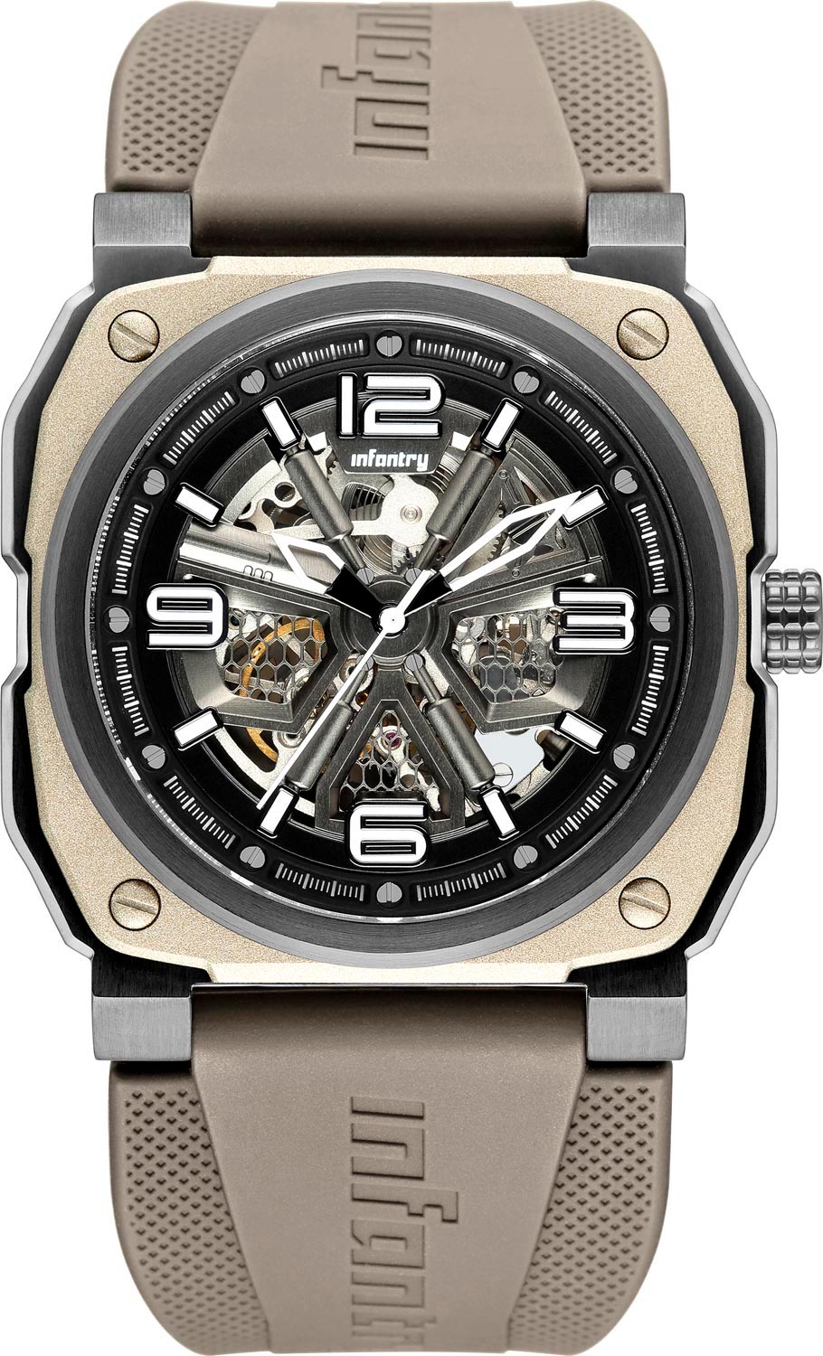 С этими стильными и невероятно привлекательными часами можно смело рисковать и совершать безумные поступки. Автоматические мужские часы Warrior. Стальной модульный корпус состоящий из 4-х частей. Двухуровневый циферблат. Сквозь окошки-сеточки на циферблате можно наблюдать за работой часов. Накладные метки в виде арабских цифр и штрихов. Метки и стрелки с люминесцентным покрытием, которое светится в темноте после непродолжительной зарядки на свету. Прозрачная задняя крышка. Рифленая заводная головка с защитой. Удобный силиконовый ремешок с возможностью быстрой замены. Классическая застежка.