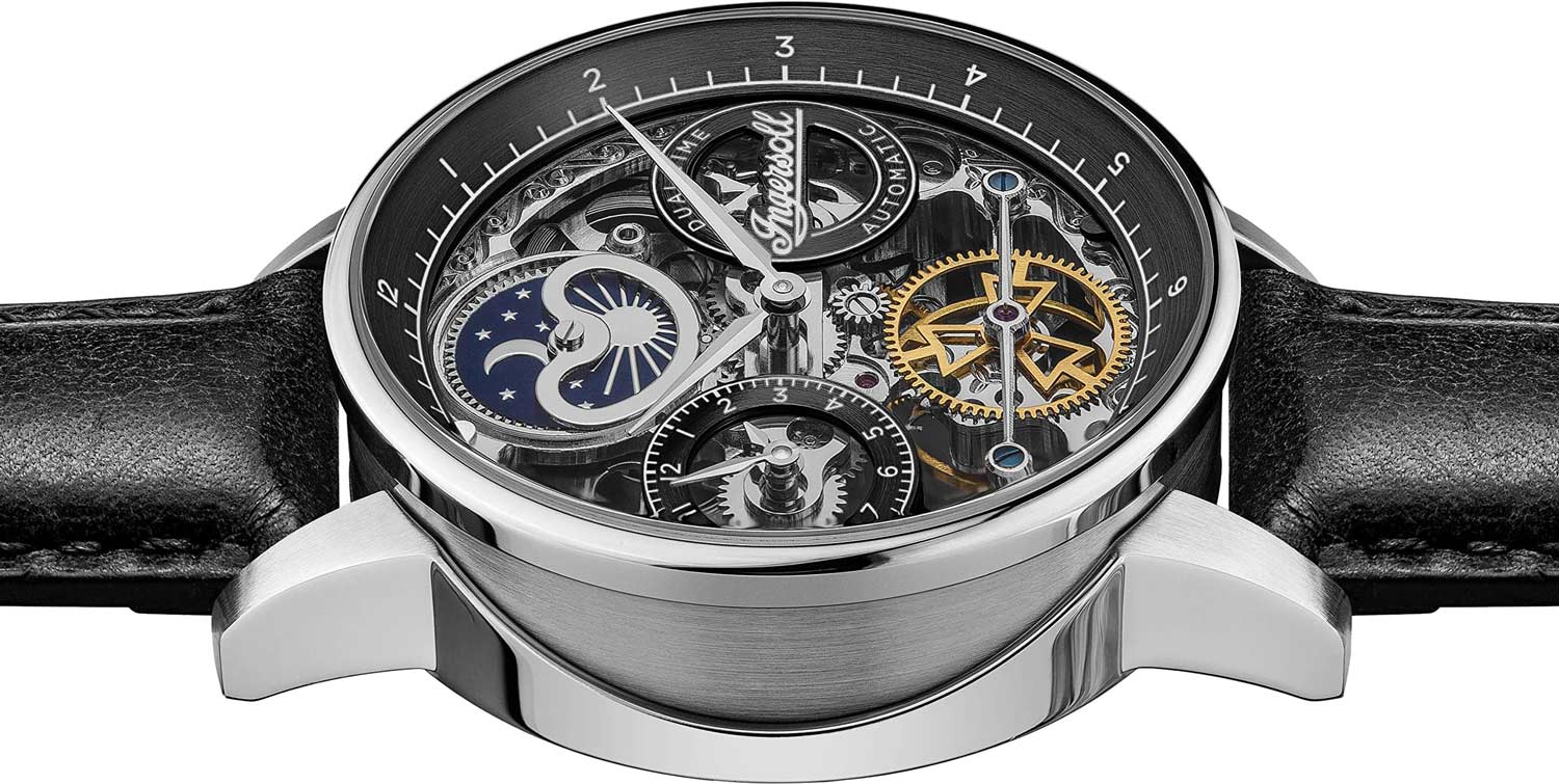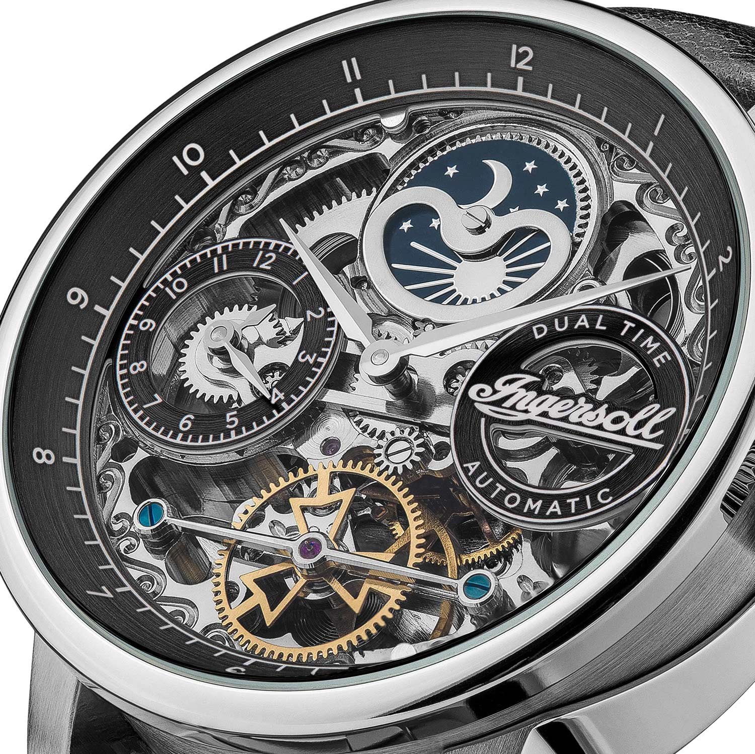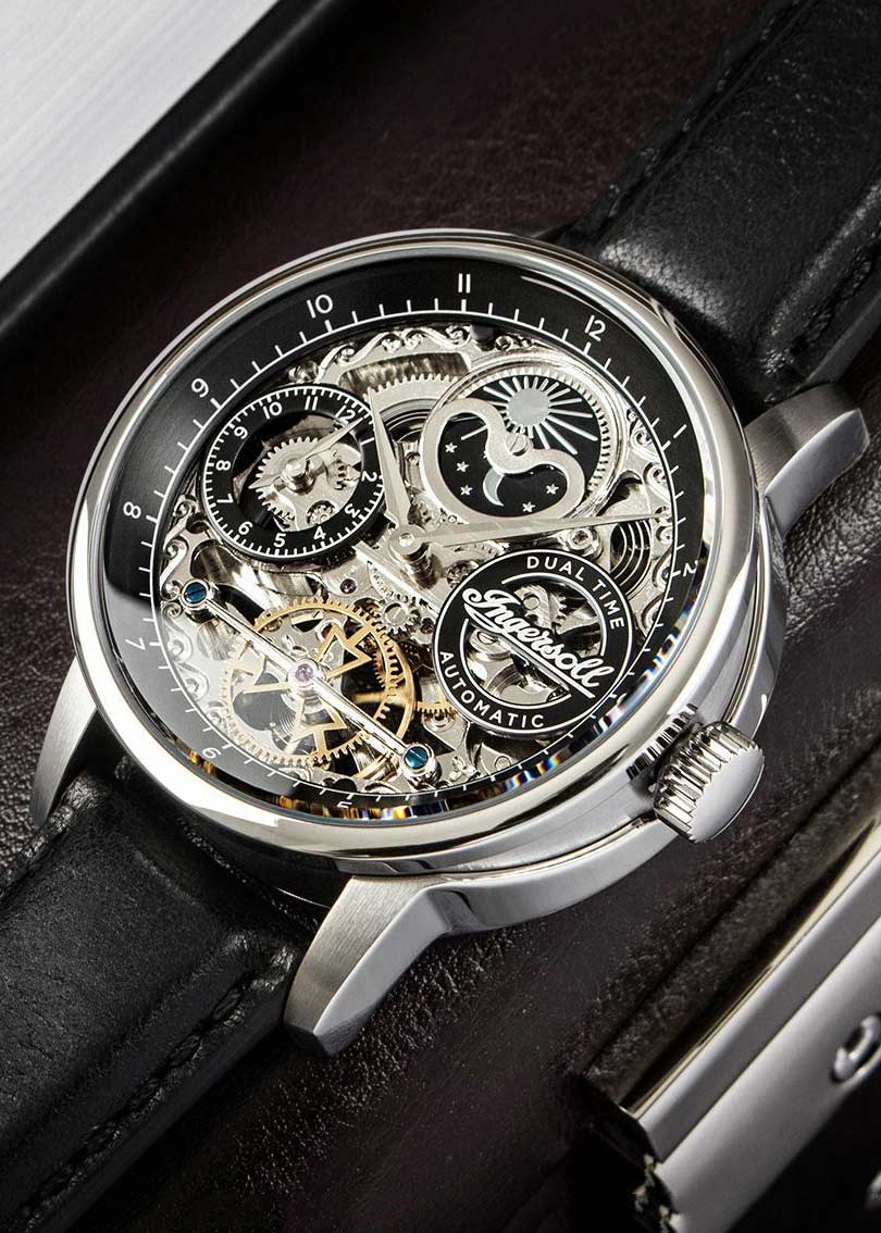 Скелетонизированные часы для мужчин The Jazz. В механизме 22 камня. Круглый стальной корпус. Второй часовой пояс на отдельном циферблате с часовой и минутной стрелками. Индикатор день/ночь. Рифленая заводная головка.