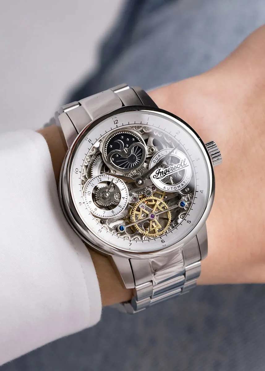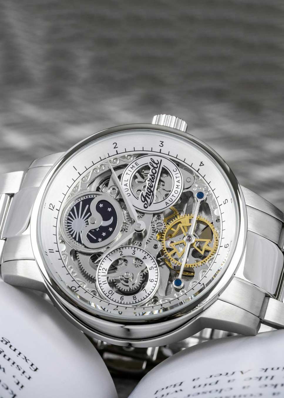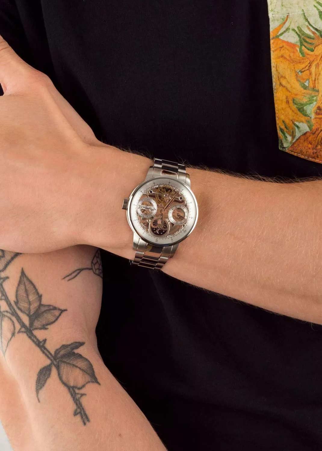 Скелетонизированные часы для мужчин The Jazz. В механизме 22 камня. Круглый стальной корпус. Второй часовой пояс на отдельном циферблате с часовой и минутной стрелками. Индикатор день/ночь. Рифленая заводная головка.