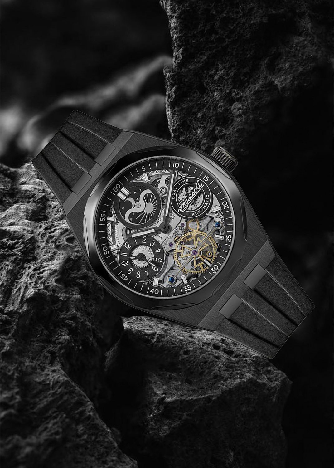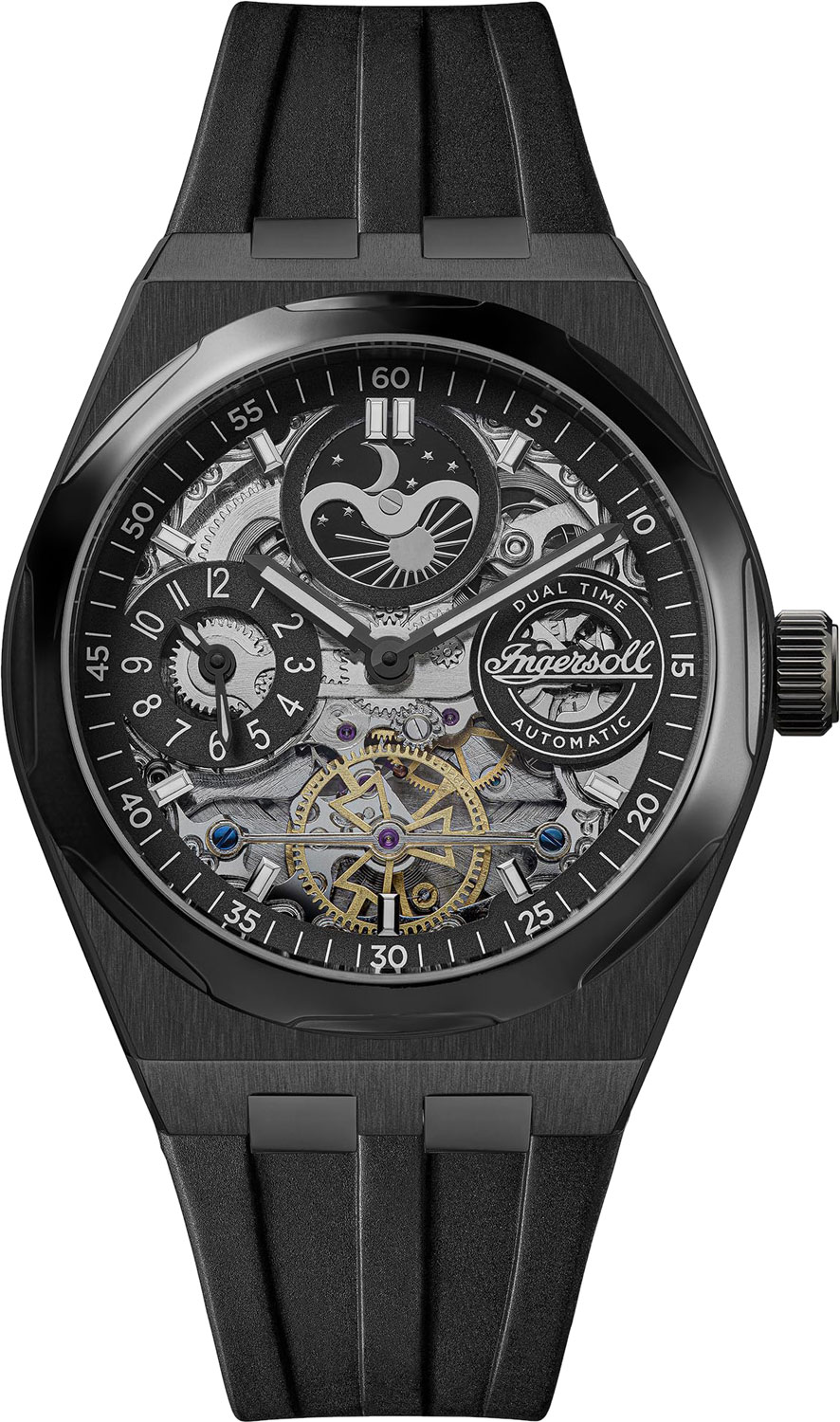 Скелетонизированные часы. В механизме 22 камня. Круглый стальной корпус. Второй часовой пояс на отдельном циферблате с часовой и минутной стрелками. Индикатор день/ночь. Рифленая заводная головка.