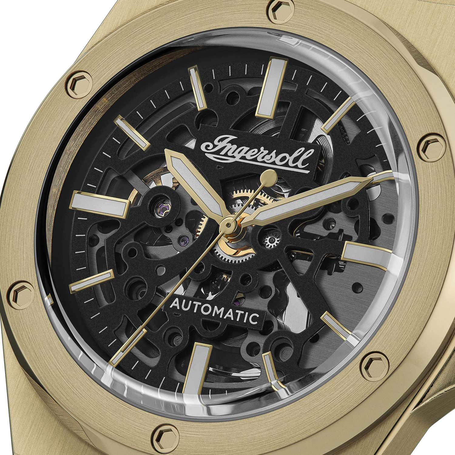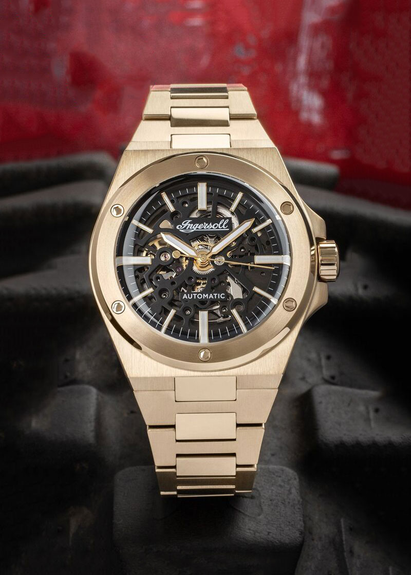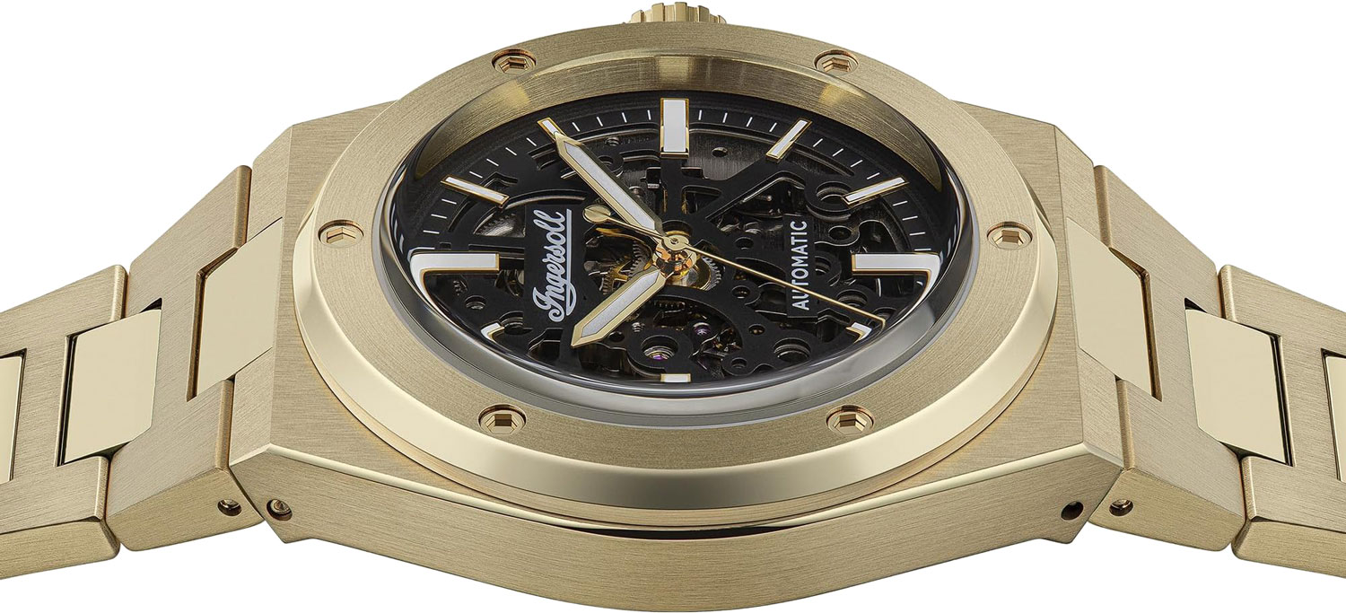 Скелетонизированные часы. В механизме 20 камней. Стальной корпус. Безель с декоративными винтами. Метки в виде штрихов. Рифленая заводная головка с защитой. Завинчивающаяся задняя крышка. Стальной браслет с раскладывающейся застежкой.