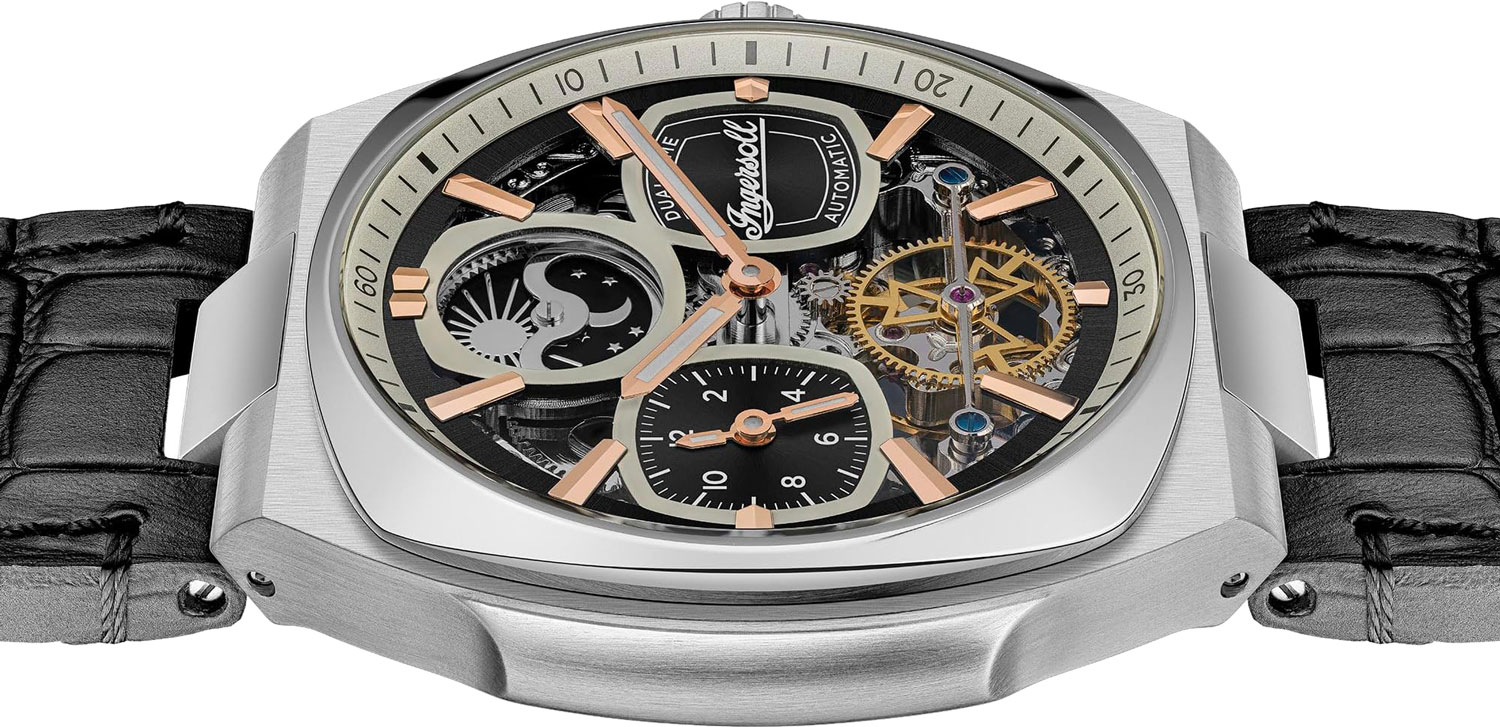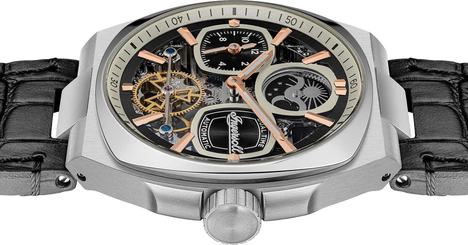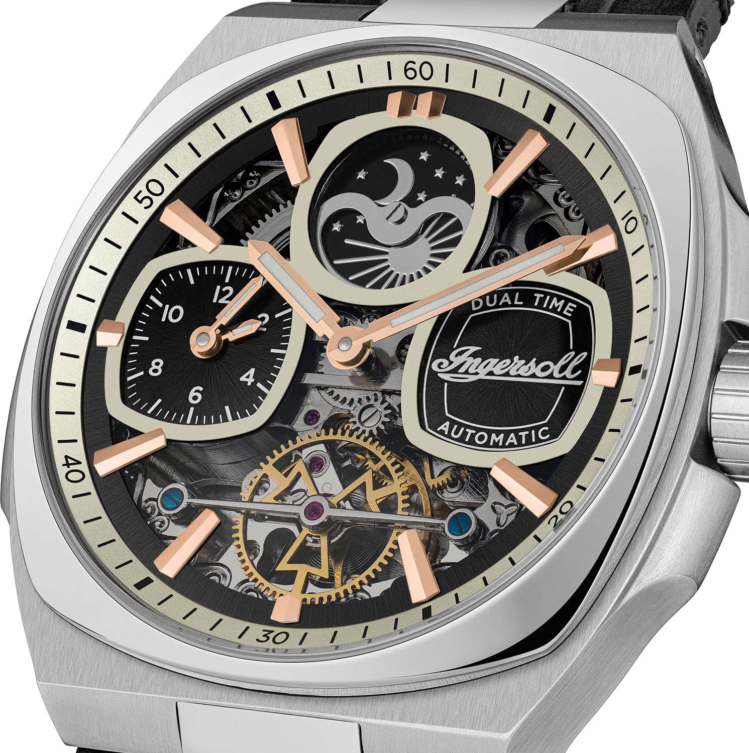 Скелетонизированные часы. В механизме 22 камня. Стальной корпус. Метки в виде штрихов. Второй часовой пояс на отдельном циферблате с часовой и минутной стрелками. Индикатор день/ночь. Рифленая заводная головка с защитой.