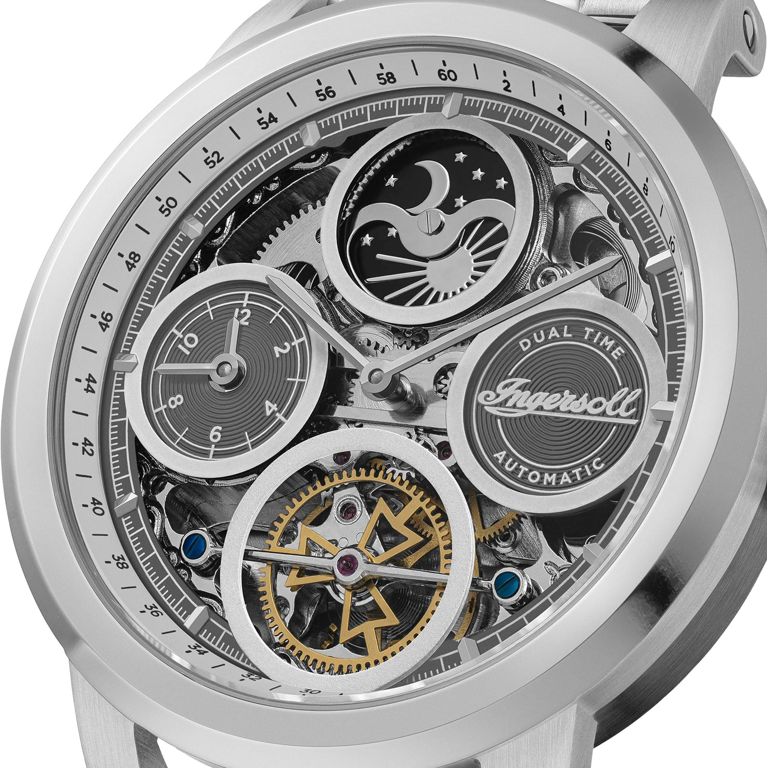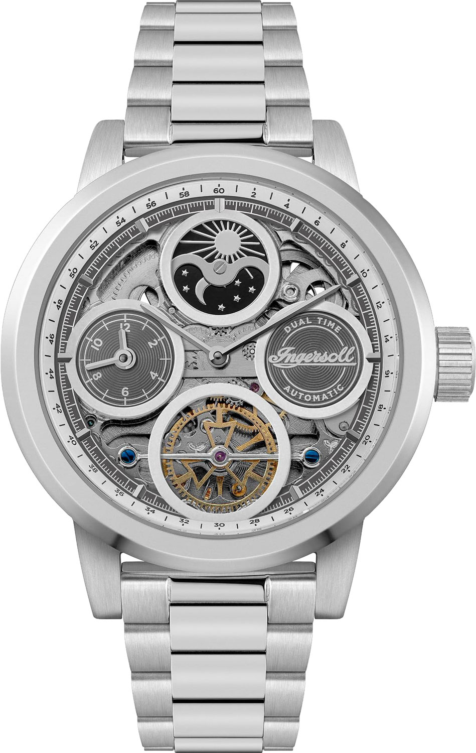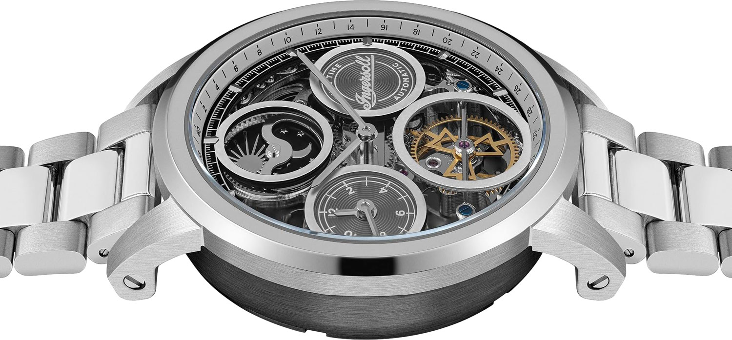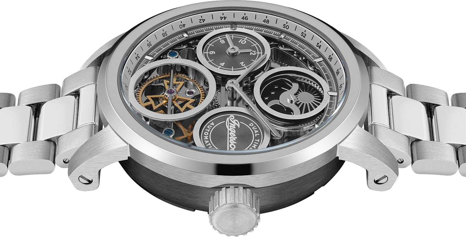 Скелетонизированные часы. В механизме 22 камня. Круглый стальной корпус. Метки в виде штрихов. Второй часовой пояс на отдельном циферблате с часовой и минутной стрелками. Индикатор день/ночь. Рифленая заводная головка.