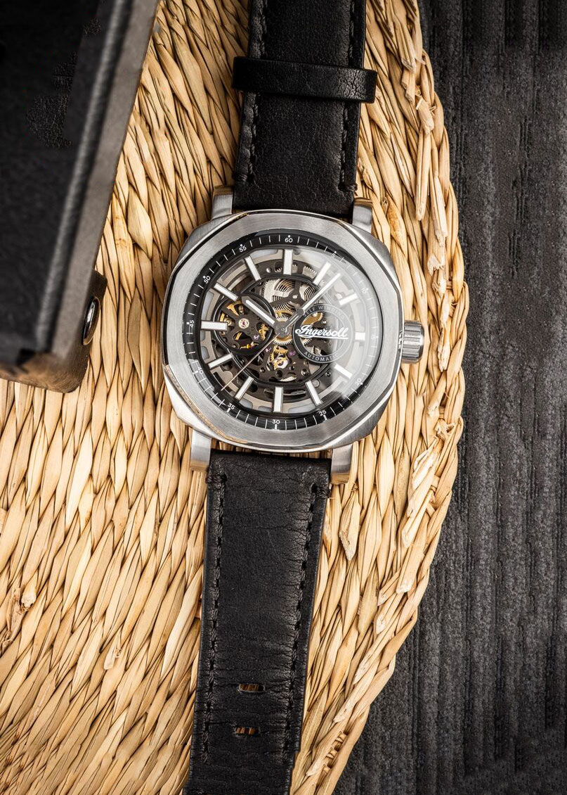 Скелетонизированные часы. В механизме 20 камней. Стальной корпус. Метки в виде штрихов. Рифленая заводная головка. Завинчивающаяся прозрачная задняя крышка. Кожаный ремешок с классической застежкой.
