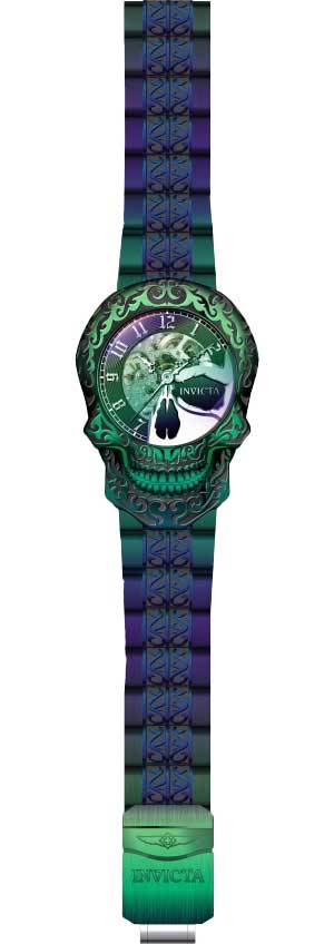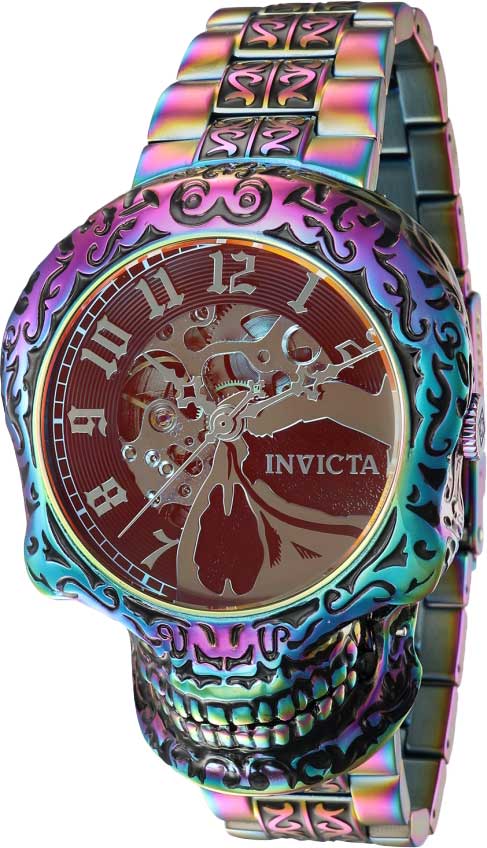 Необычный, вызывающий дизайн этих часов от Invicta станет настоящей находкой для ценителей уникальных аксессуаров. Скелетонизированные часы. В механизме 20 камней. Стальной корпус выполнен в форме черепа и украшен гравировкой. Метки в виде арабских цифр. Прозрачная задняя крышка. Заводная головка с защитой. Браслет с раскладывающейся застежкой украшен гравировкой. Застежка с системой блокировки. Производитель оставляет за собой право вносить изменения во внешний вид часов. Уточняйте при заказе, какой вариант в наличии в данный момент.